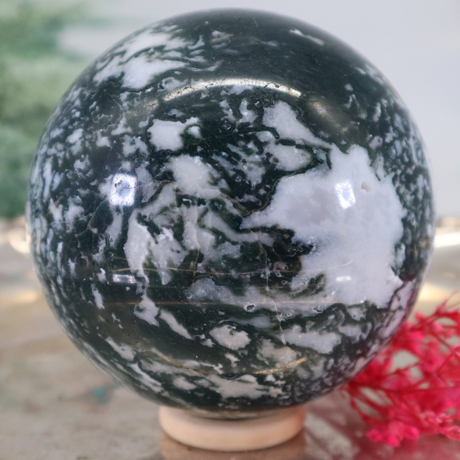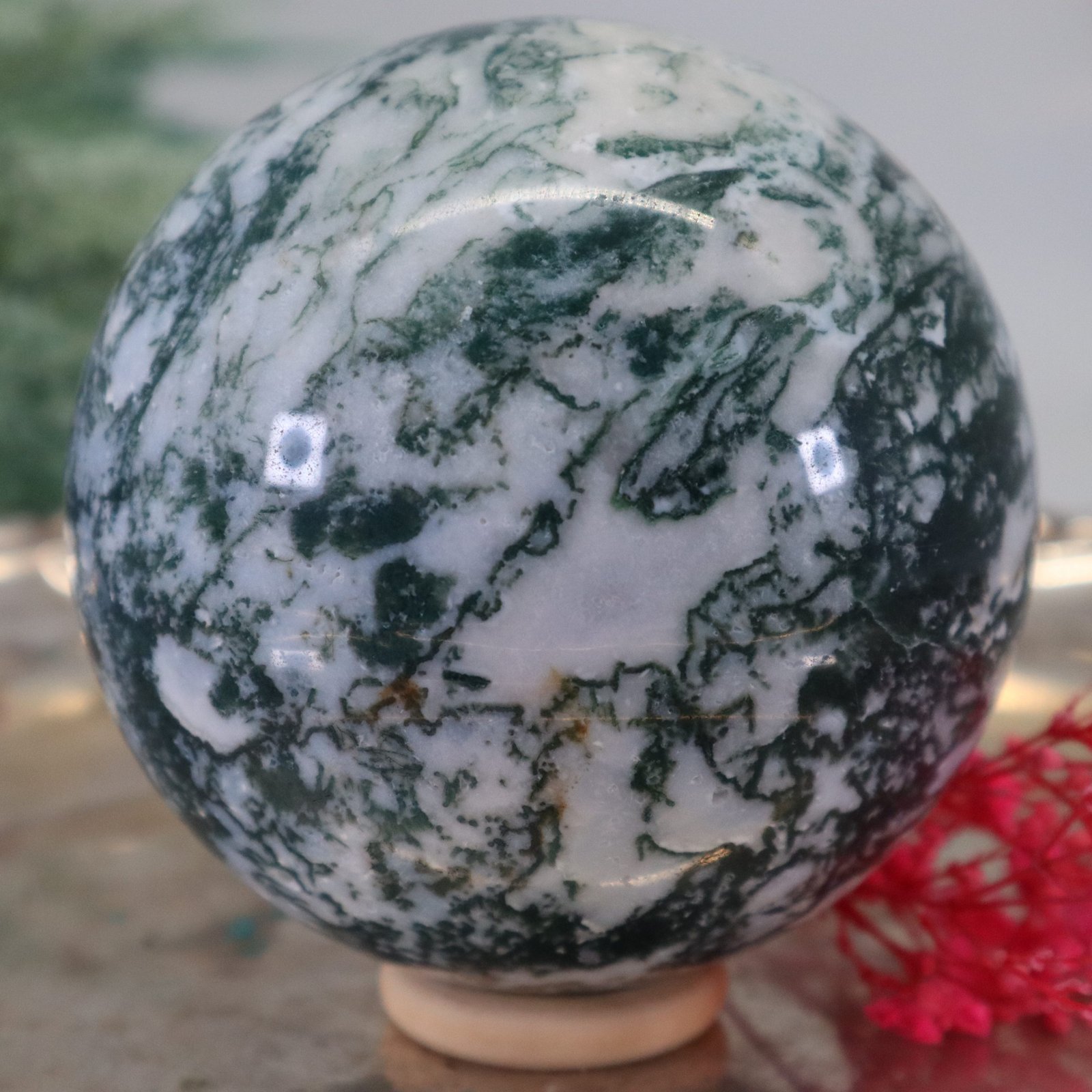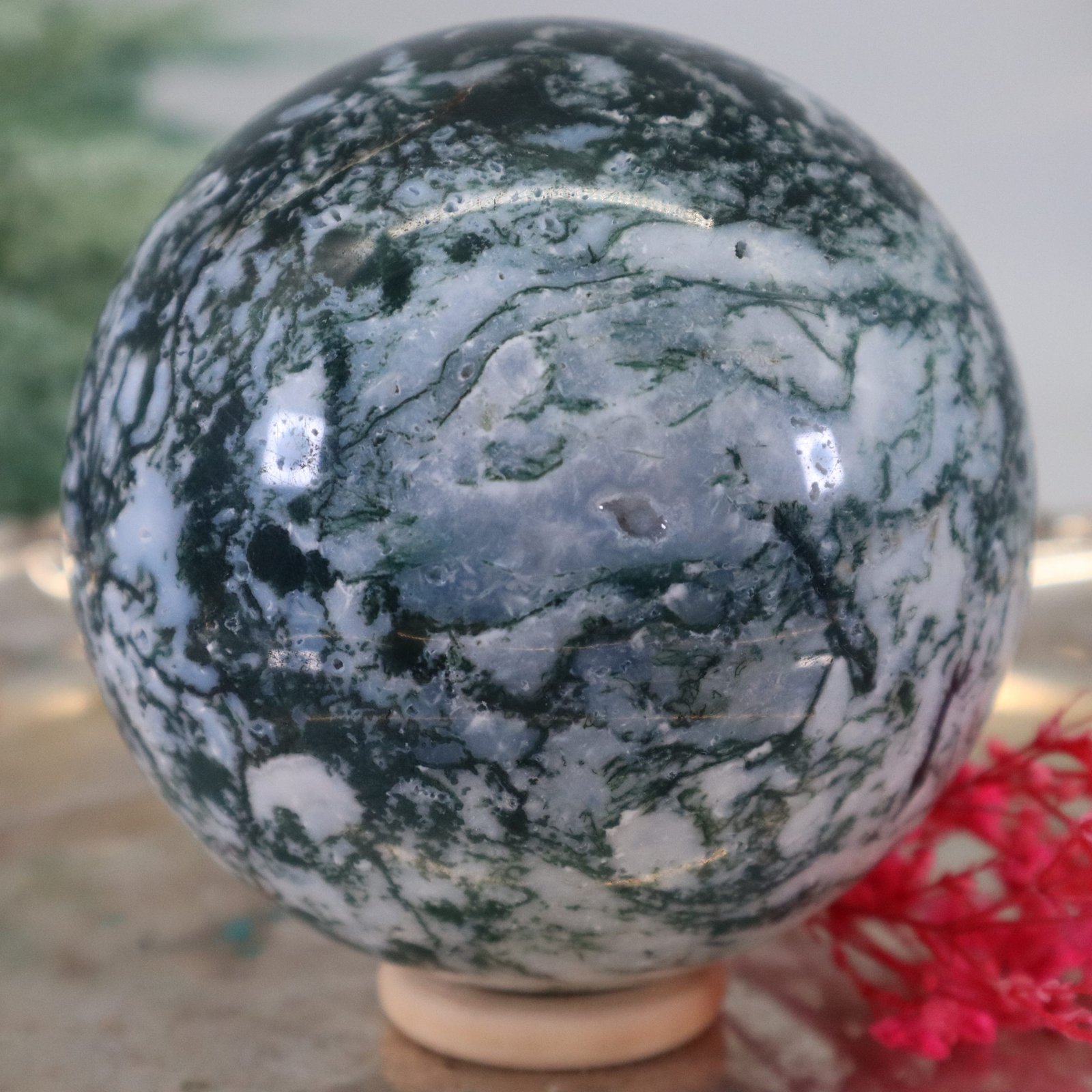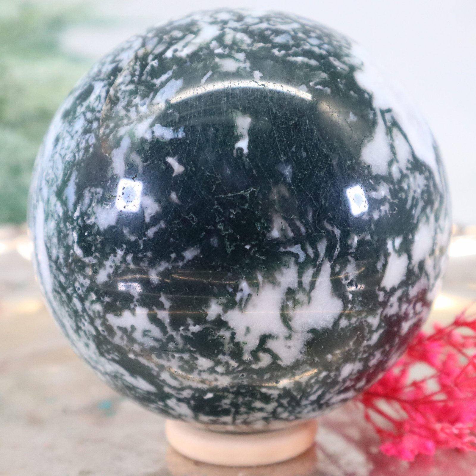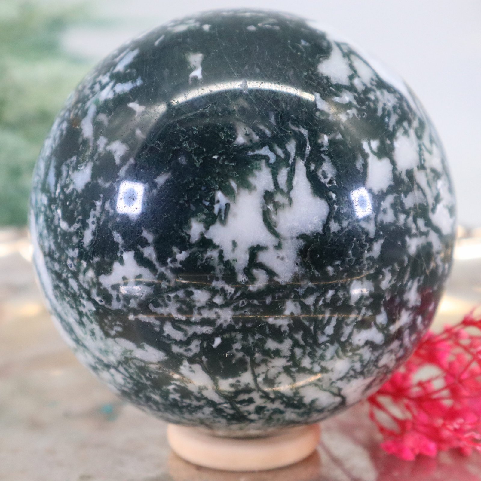 - Größe: Mit einem Durchmesser von 79 mm ist deine Moosachatkugel ziemlich groß und schwer, was sie zu einem auffälligen Dekorationsobjekt macht.