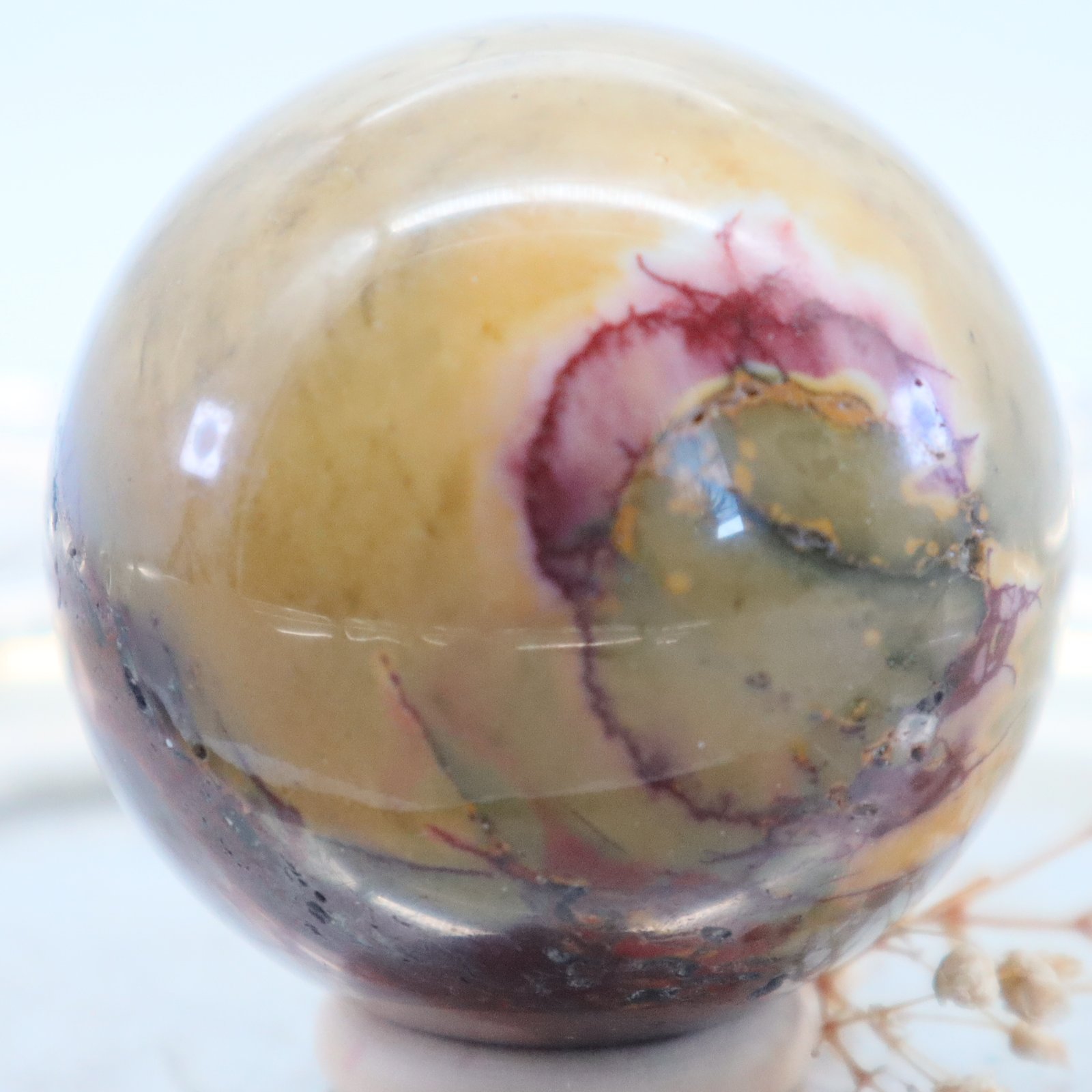 GROSSE MOOKAIT Edelsteinkugel 58 mm, Lila Gelb, schöne Maserung, hohe Qualität, Glänzend