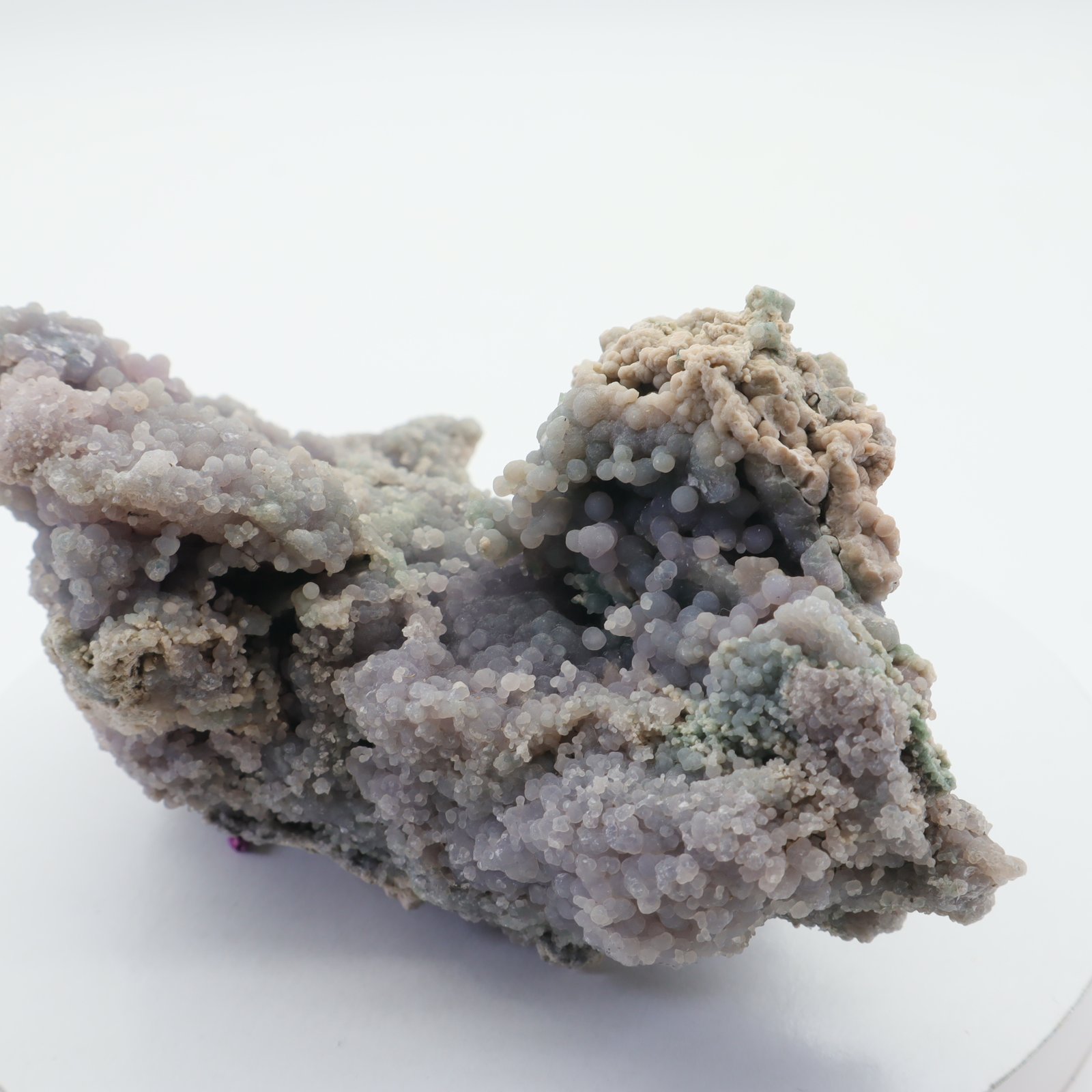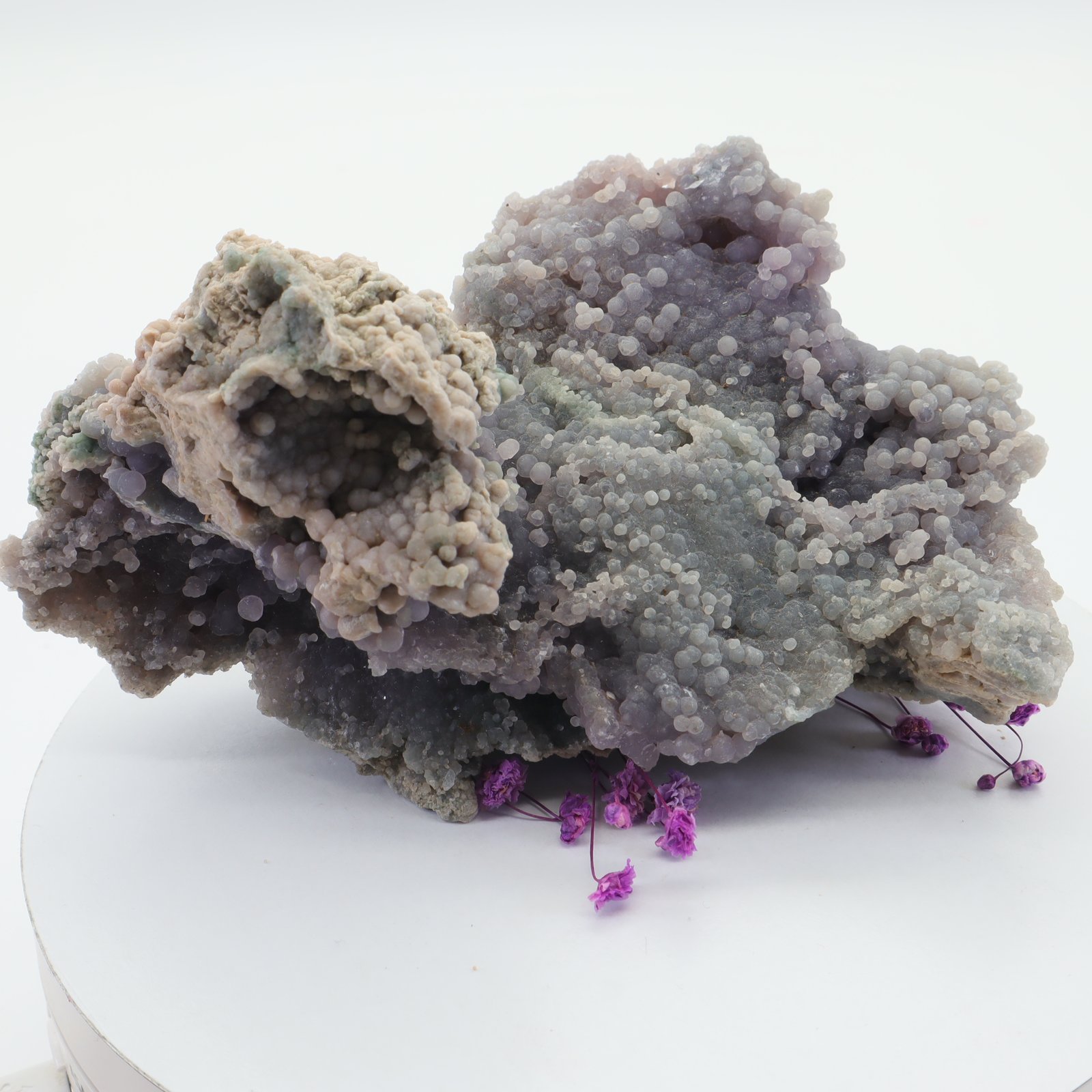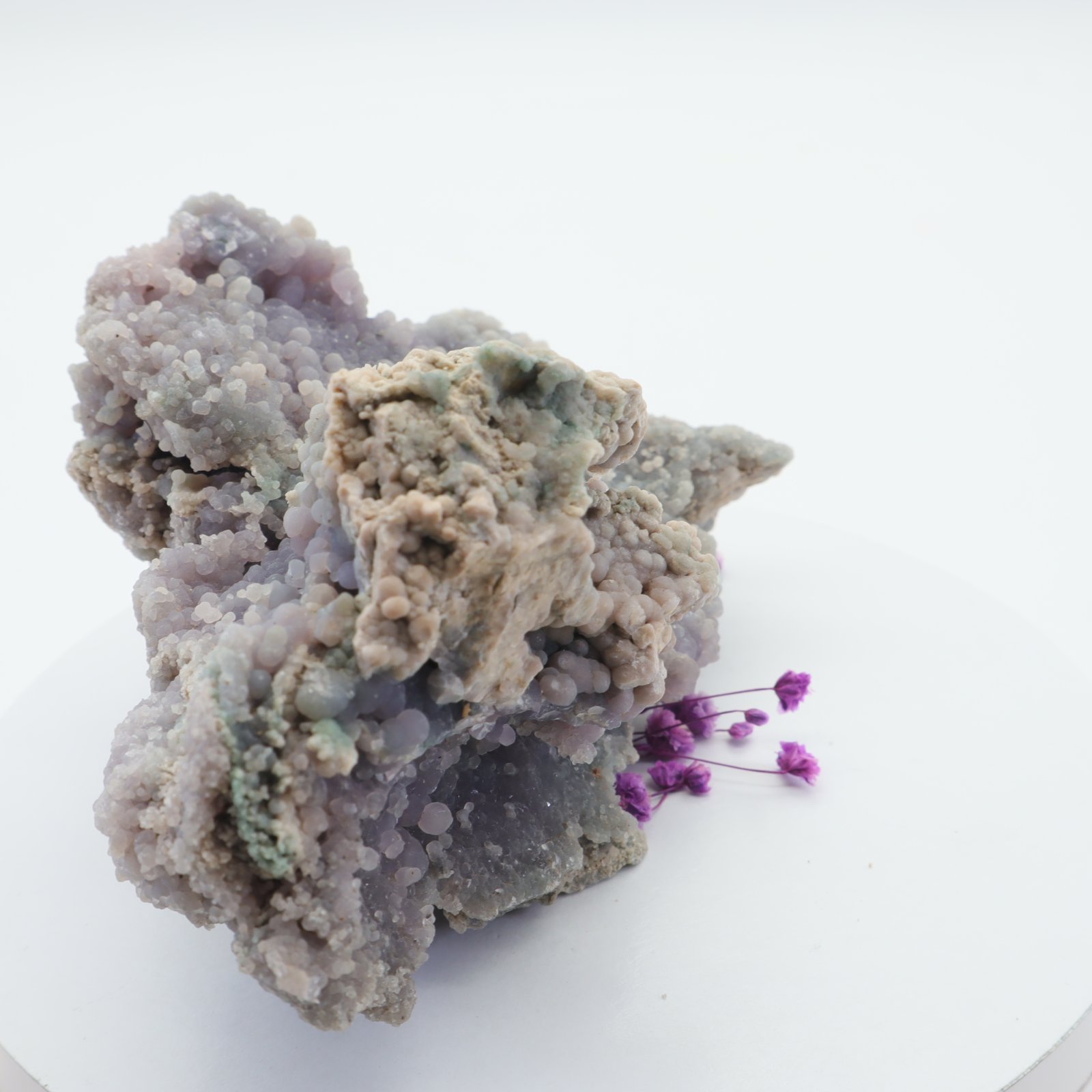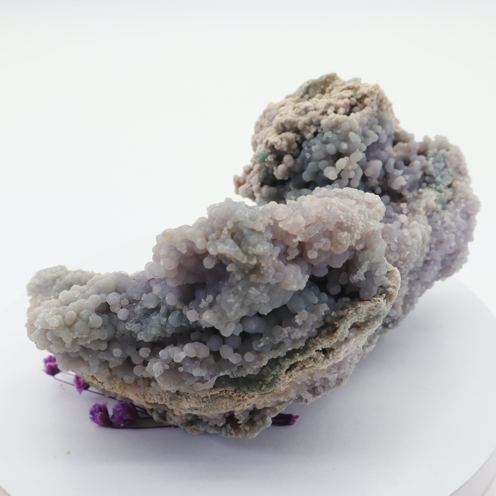 Traubenachat ist der Name für den botryoiden Purple Chalcedon, der kürzlich in Indonesien entdeckt wurde. Botryoide bedeutet, dass sich runde Kristalle auf natürliche Weise zusammen gebildet haben. Bisher wurde nur eine Fundstelle gefunden, was diesen Stein zu einem äußerst seltenen und wertvollen Stein macht. Die Farben reichen von dunklem Lila bis zu einem hellen Flieder oder Lavendel.