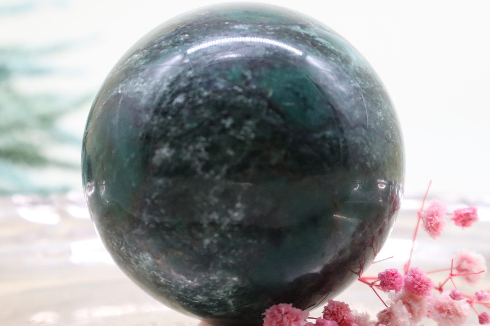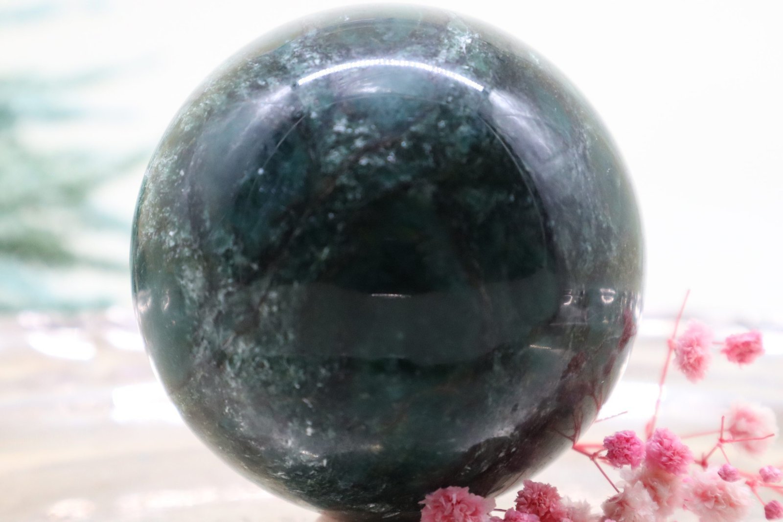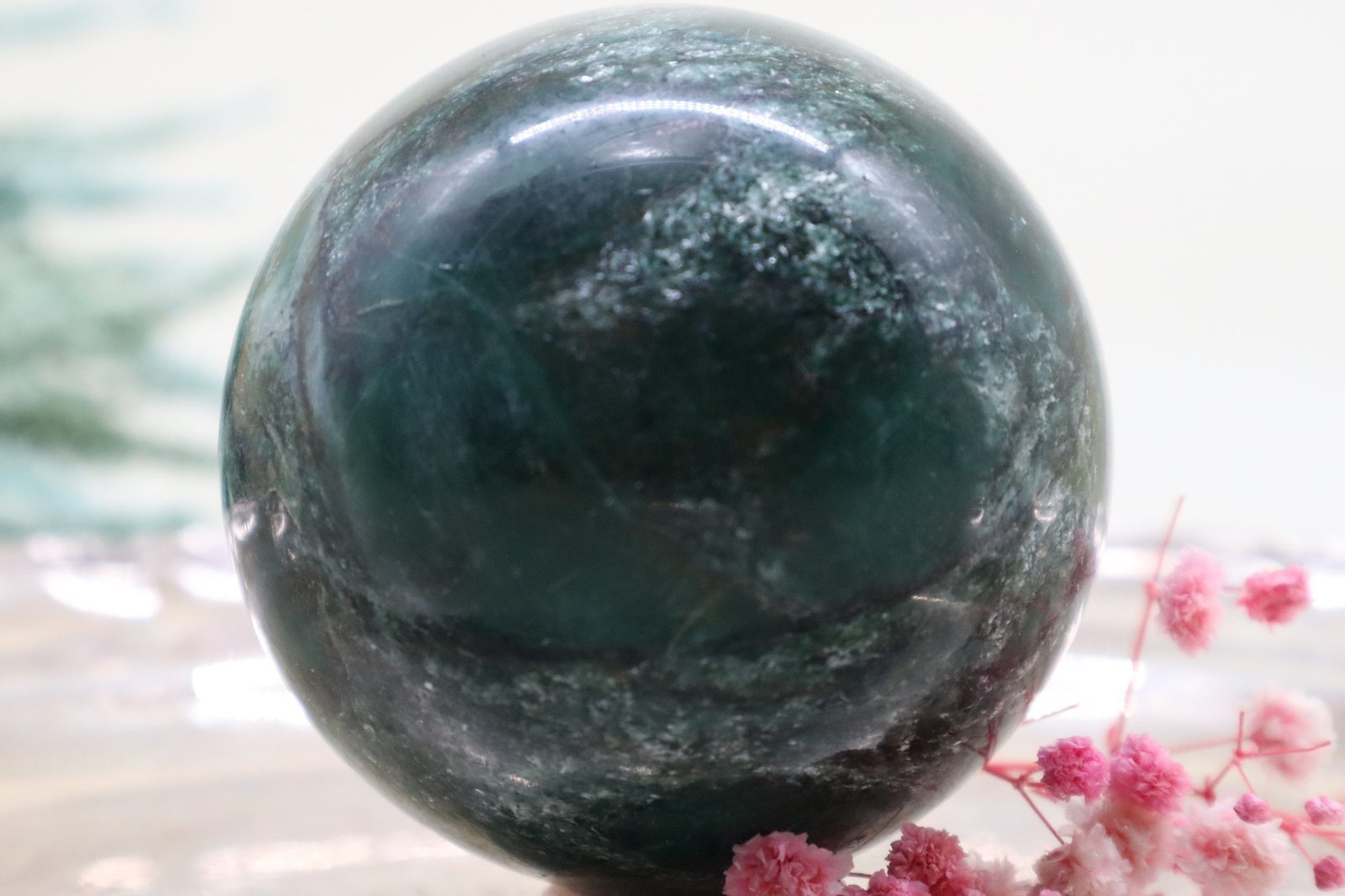 Die Oberfläche der Kugel ist exquisit poliert, was ihr einen makellosen Glanz verleiht. Dieser Hochglanz verstärkt die lebendige grüne Farbe, die von tiefen, erdigen Grüntönen bis hin zu sanften, moosigen Schattierungen reicht. Das Licht spielt auf der glatten Oberfläche, wodurch die natürlichen Farben noch intensiver und lebendiger wirken.