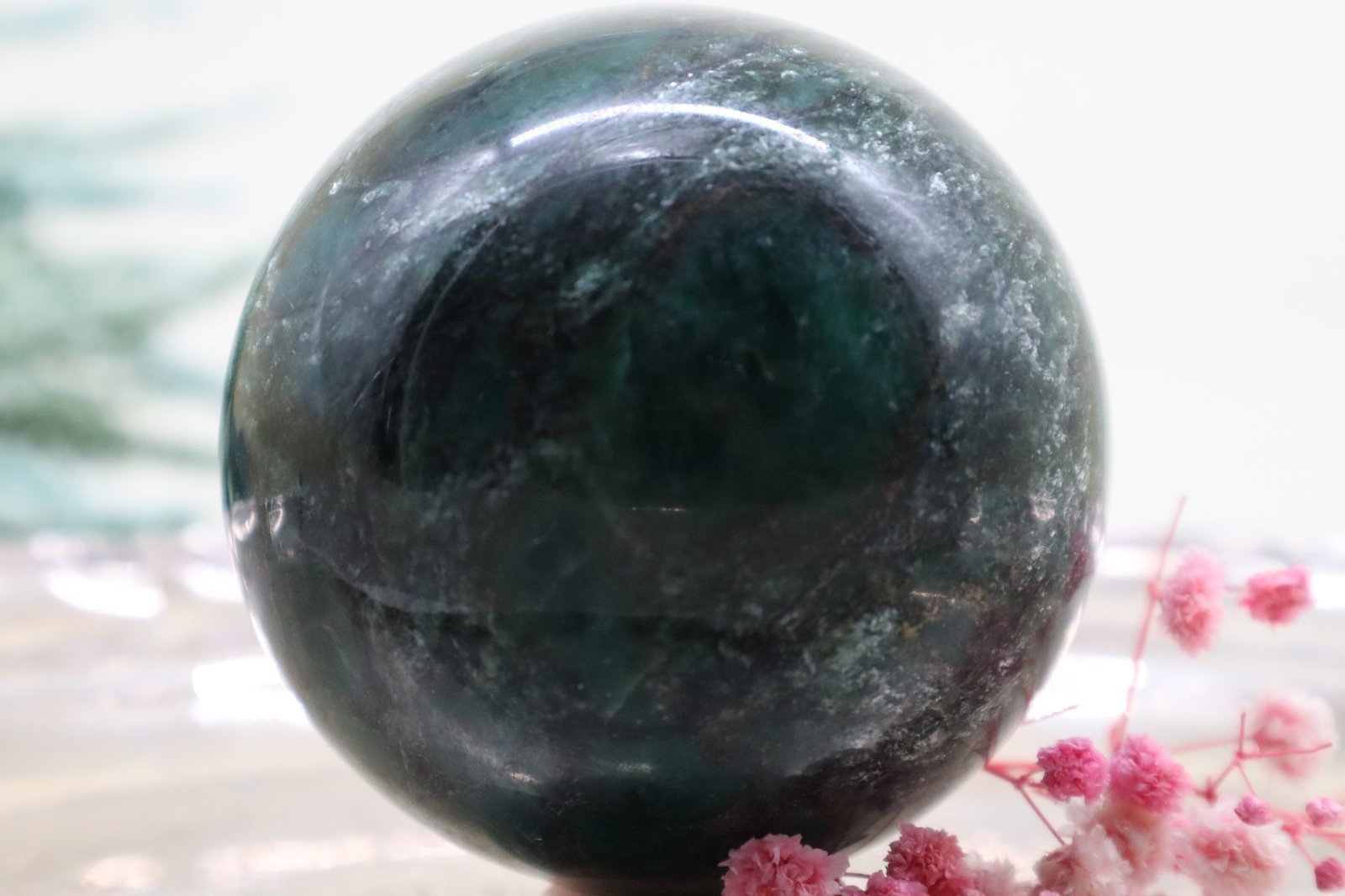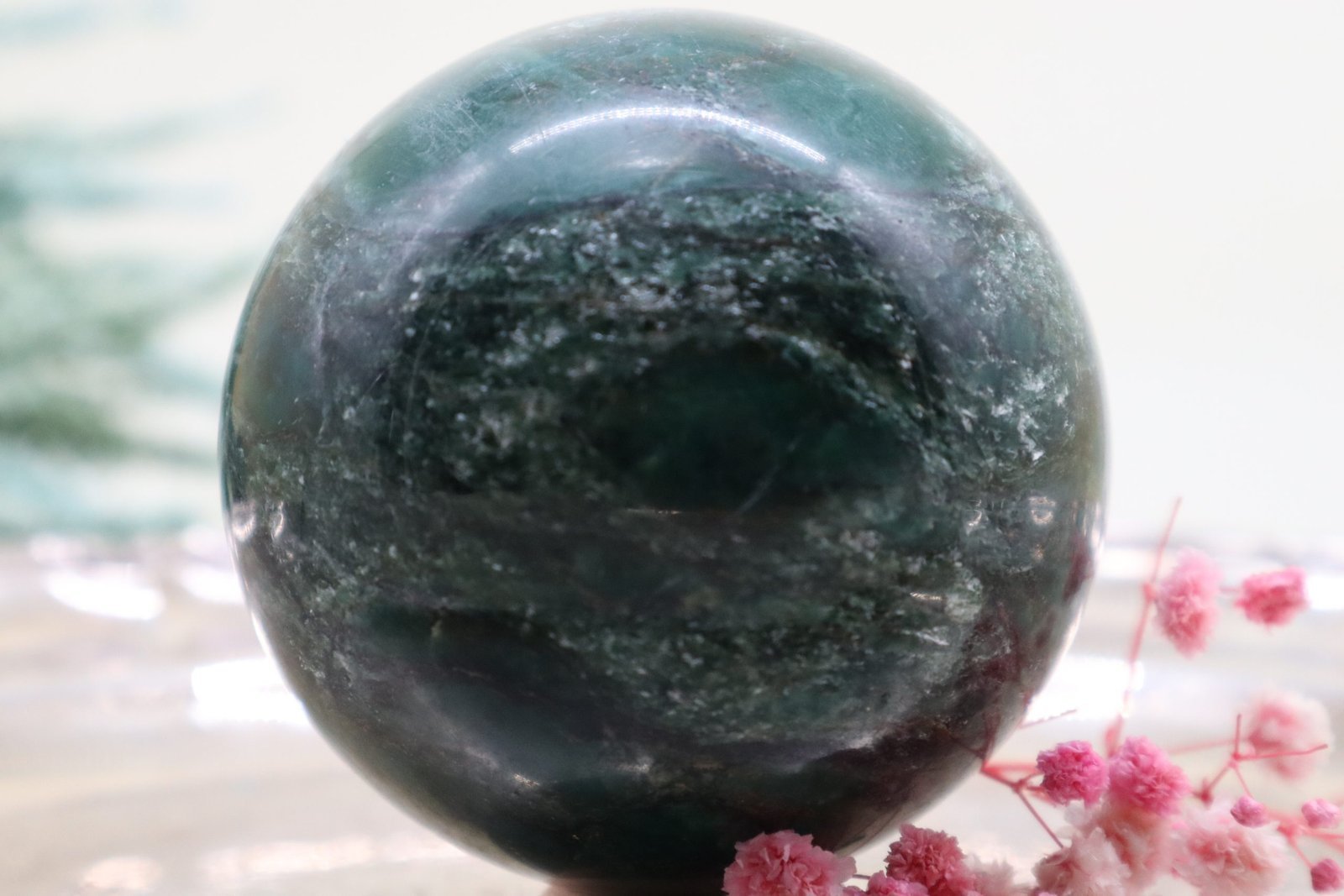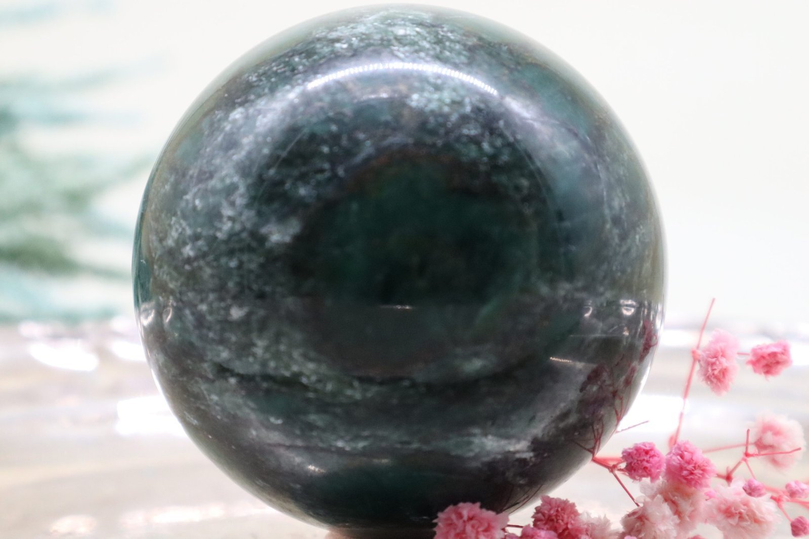 Die Oberfläche der Kugel ist exquisit poliert, was ihr einen makellosen Glanz verleiht. Dieser Hochglanz verstärkt die lebendige grüne Farbe, die von tiefen, erdigen Grüntönen bis hin zu sanften, moosigen Schattierungen reicht. Das Licht spielt auf der glatten Oberfläche, wodurch die natürlichen Farben noch intensiver und lebendiger wirken.