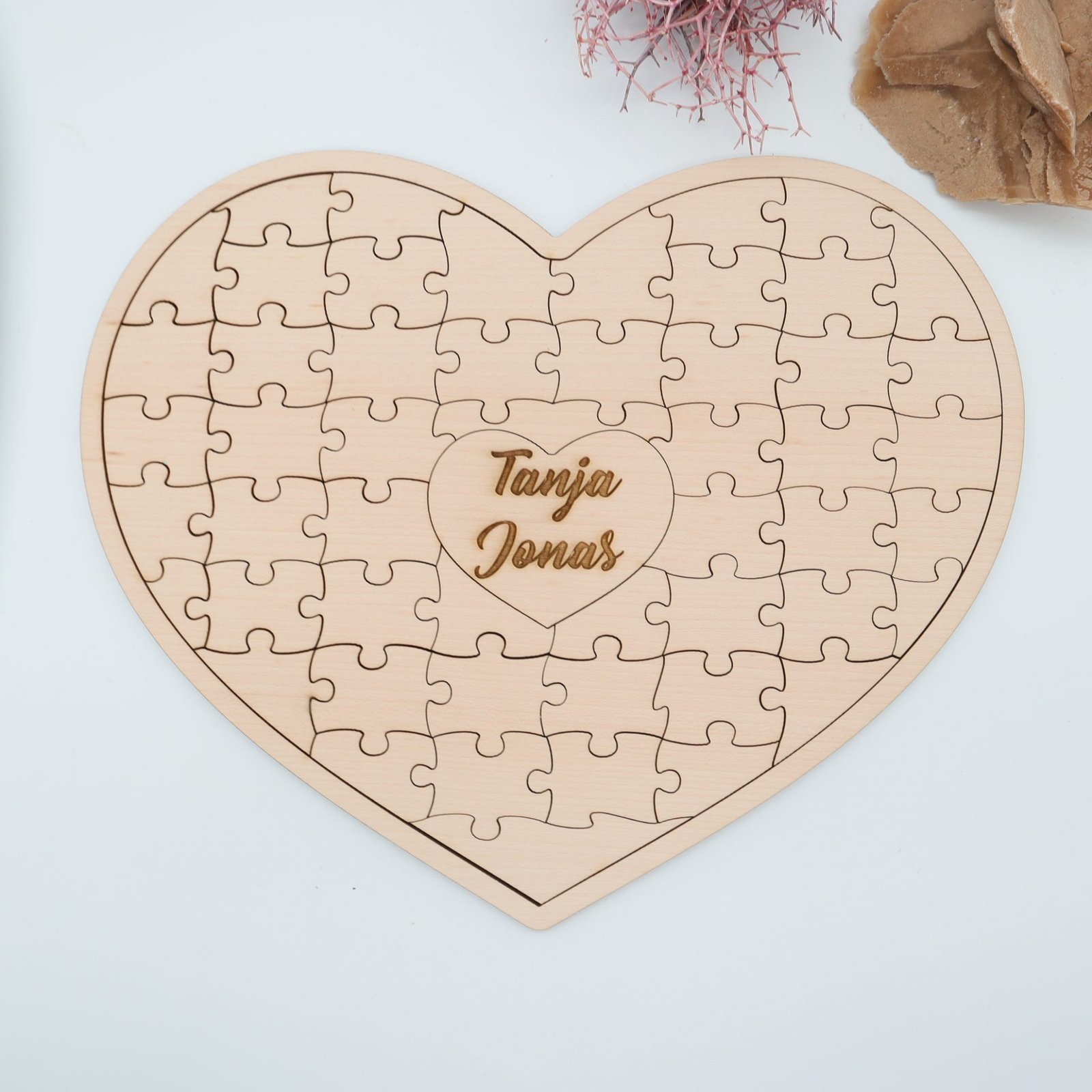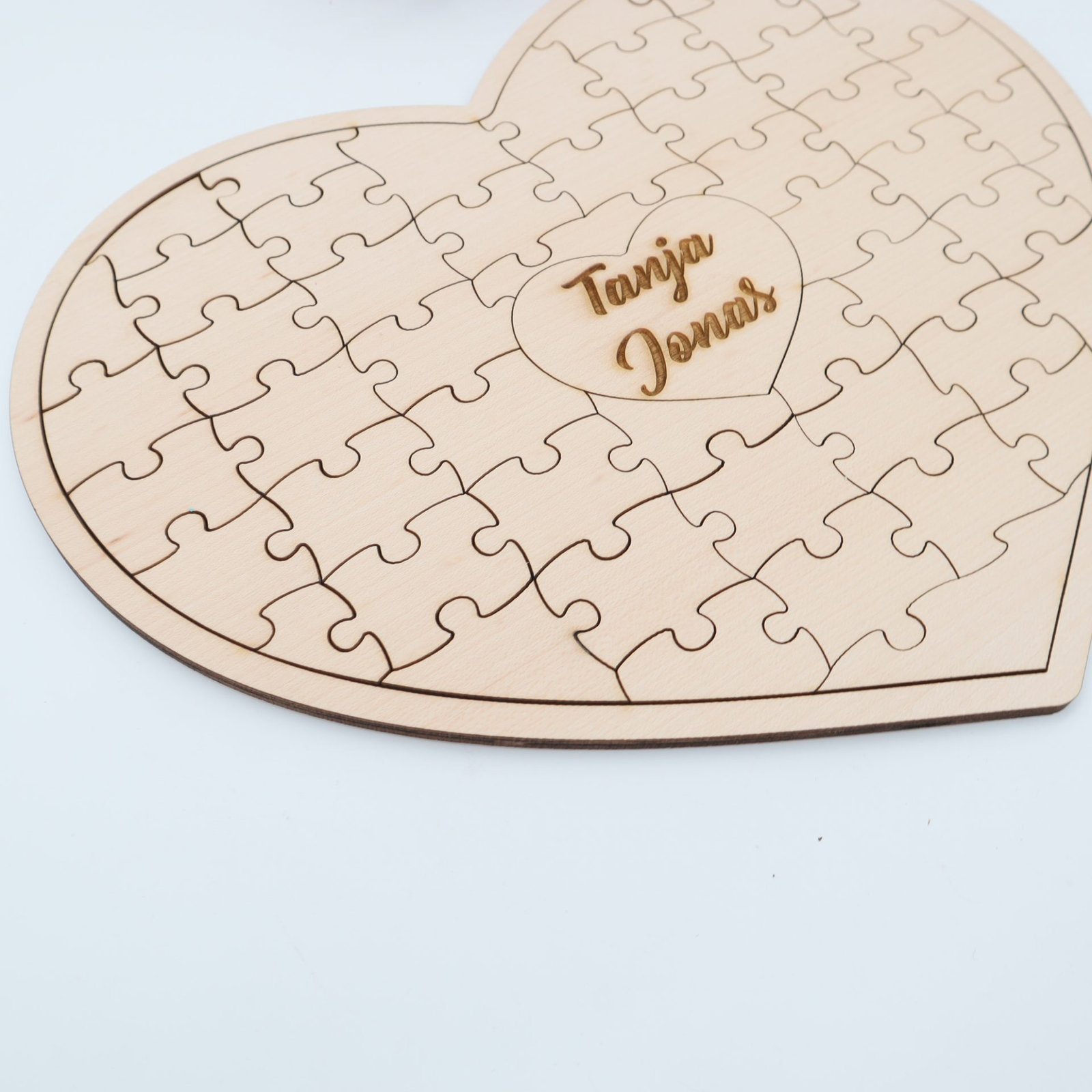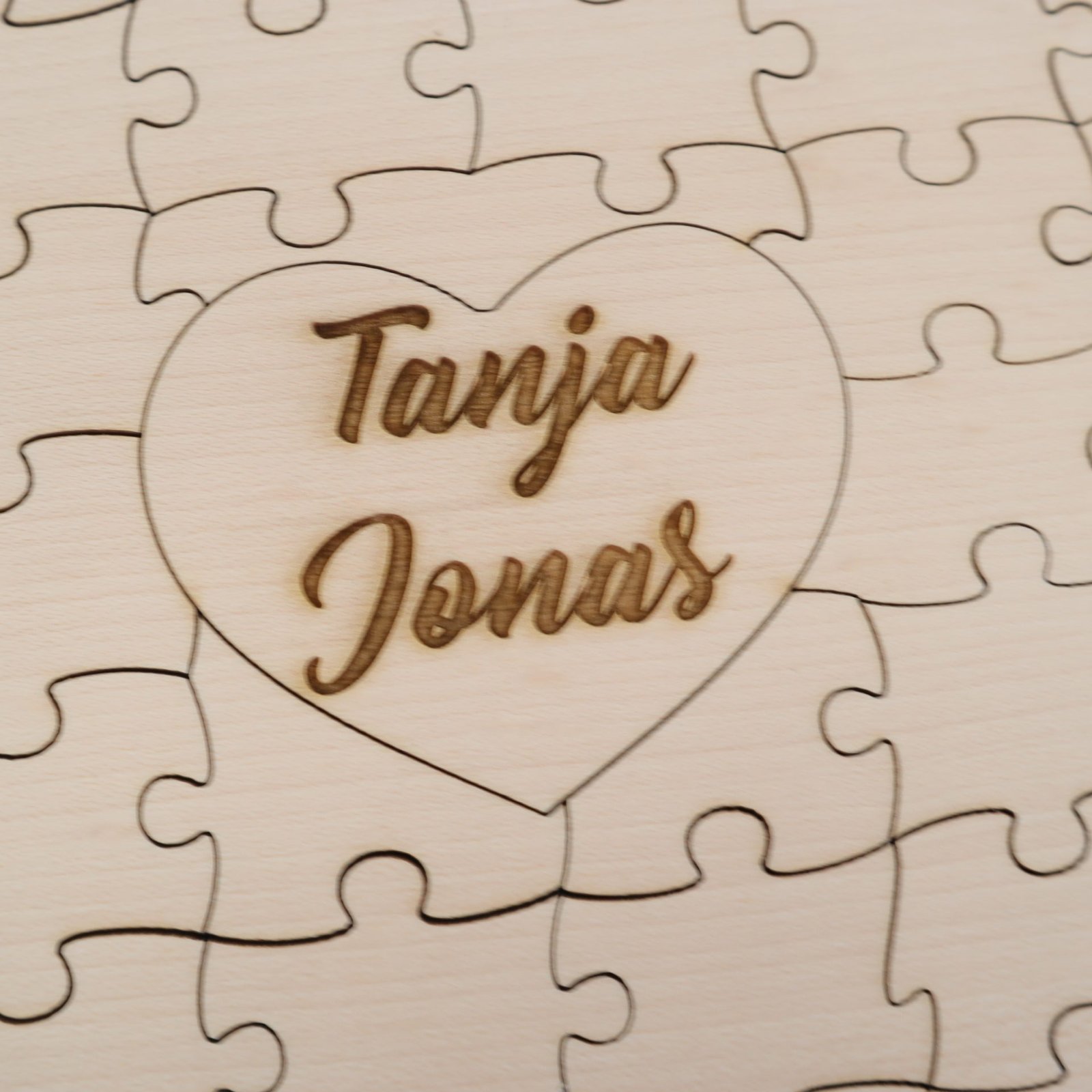 Das Herzstück dieses Puzzles liegt im Mittelpunkt – hier kannst du einen besonderen Text eingravieren lassen. Ob romantische Worte, ein bedeutungsvoller Spruch oder die Namen eines Pärchens, deine Botschaft wird dauerhaft in das Ahornsperrholz eingraviert, um die Liebe für immer festzuhalten.