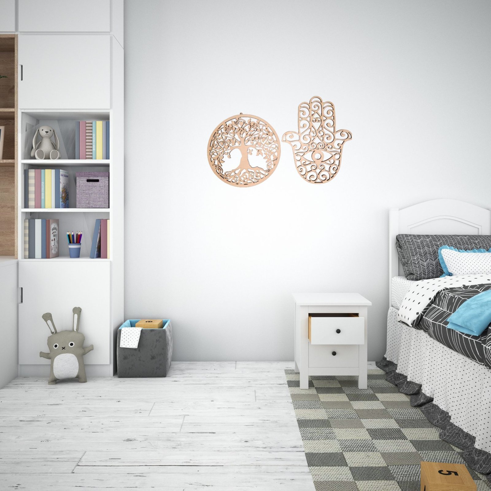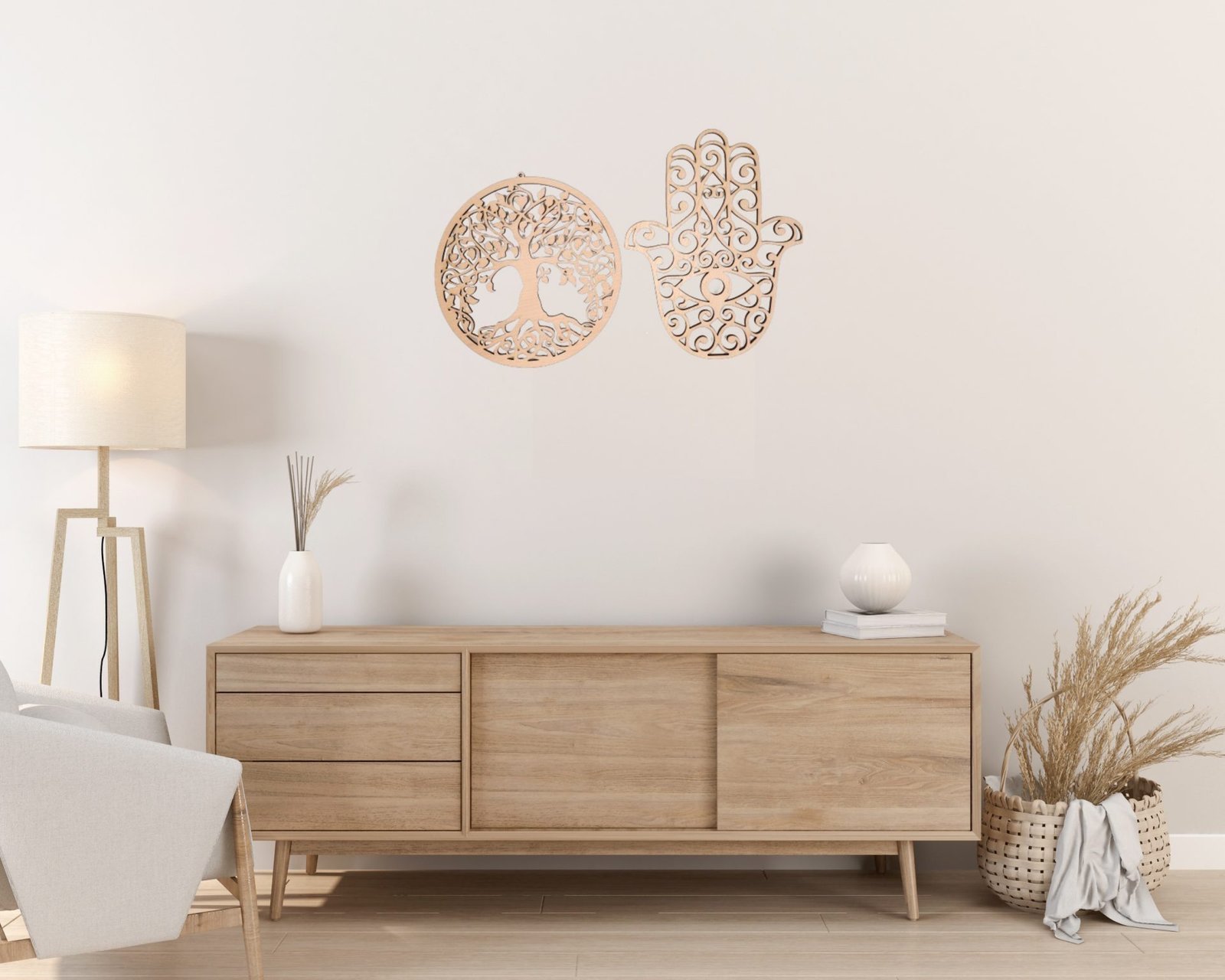 Die Hamsa Hand, in liebevoller Sorgfalt aus dem Holz geschnitten, schützt und leitet unsere Reise. Ihre offene Handfläche weist auf Empfangsbereitschaft und Großzügigkeit hin, während das Auge im Zentrum Wachsamkeit und spirituelle Erkenntnis symbolisiert. Gemeinsam bilden der Lebensbaum und die Hamsa Hand eine kraftvolle Verbindung zwischen Natur und Spiritualität.