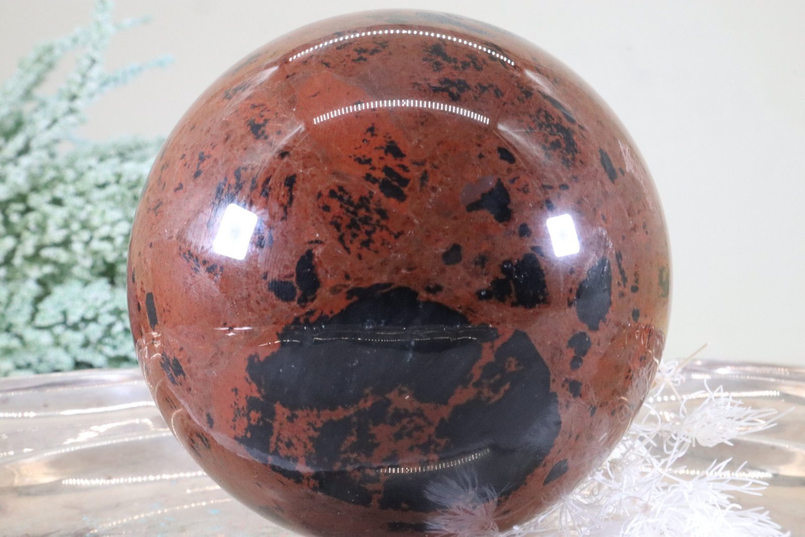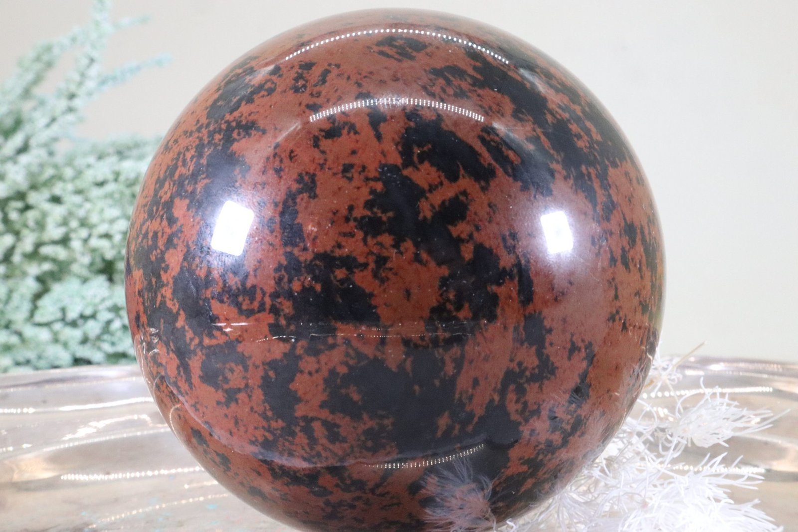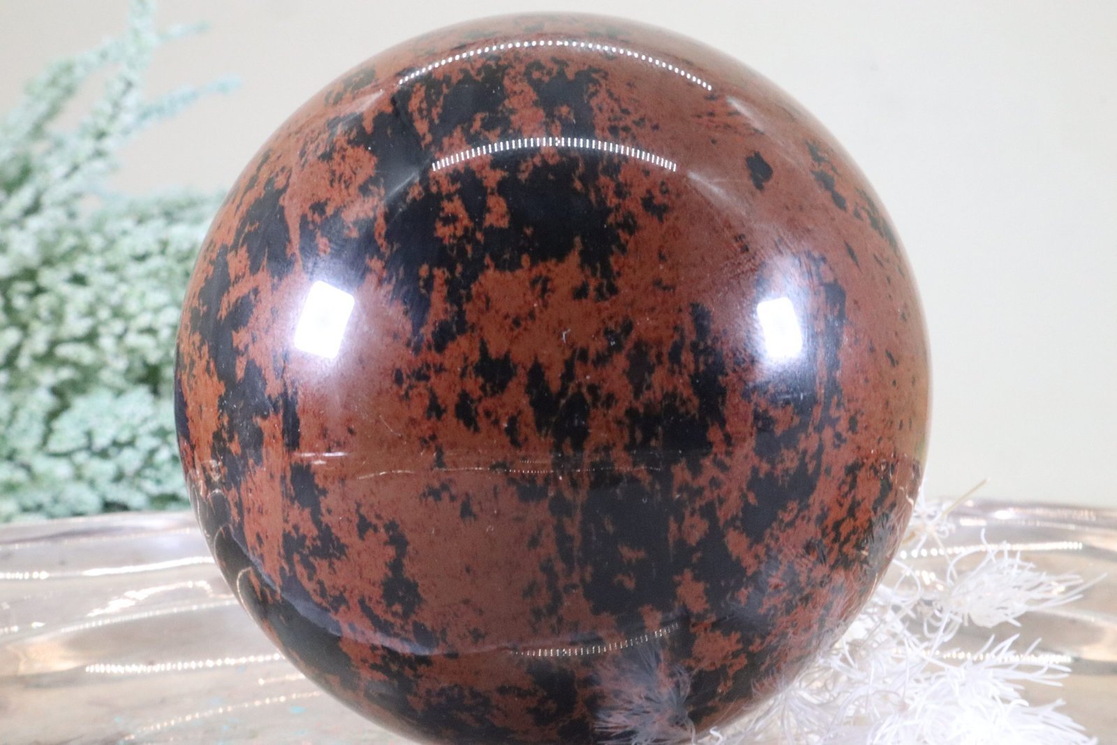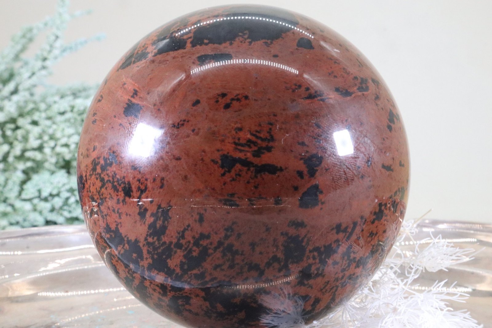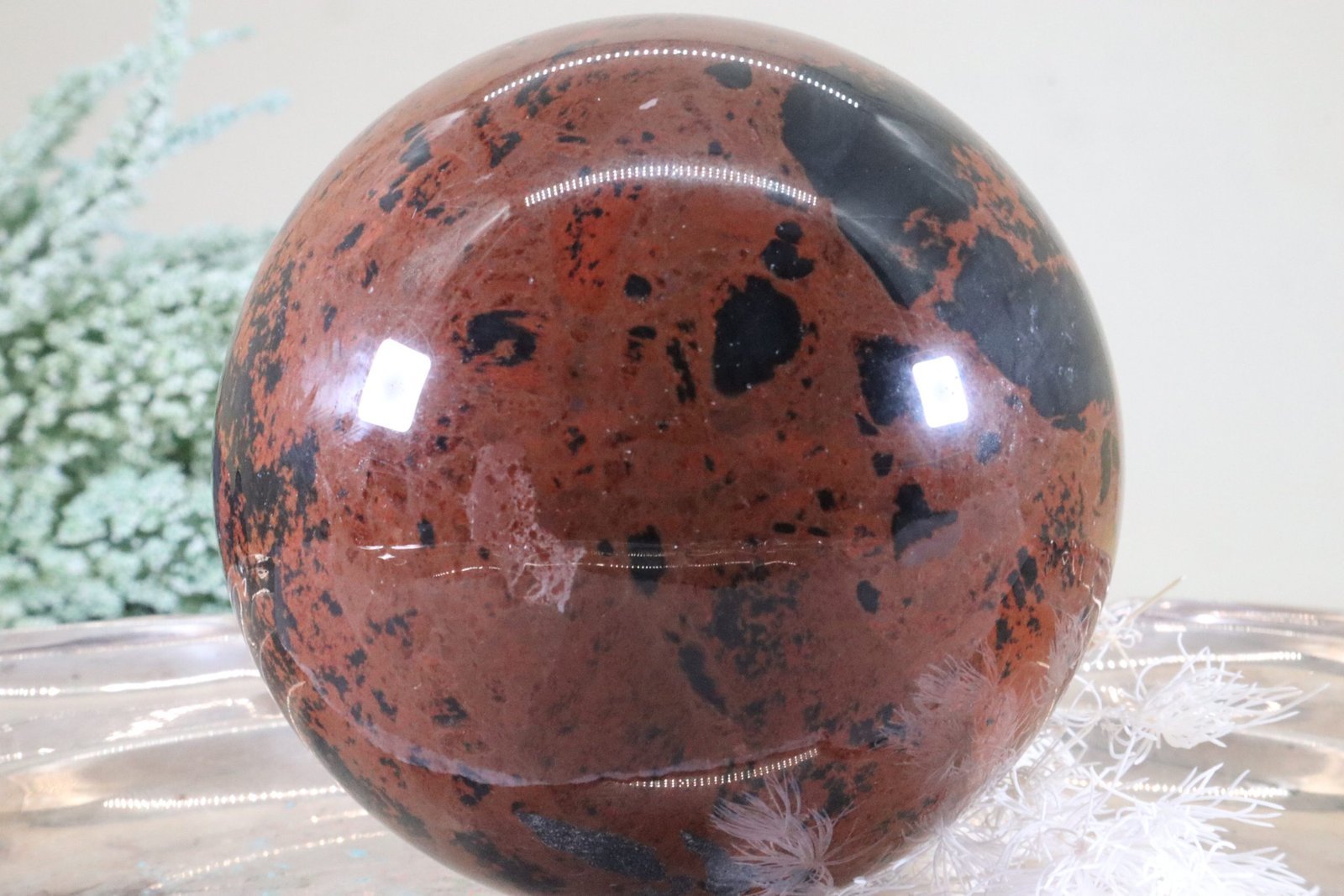 - Dekoration: Eine große Mahagoni-Edelsteinkugel ist ein beeindruckendes dekoratives Element. Sie kann auf einem edlen Sockel oder in einer Vitrine ausgestellt werden, wo ihr Glanz und die reichen Farben besonders zur Geltung kommen.