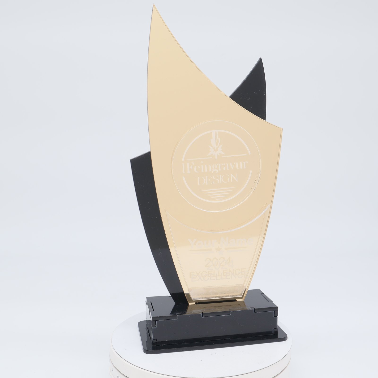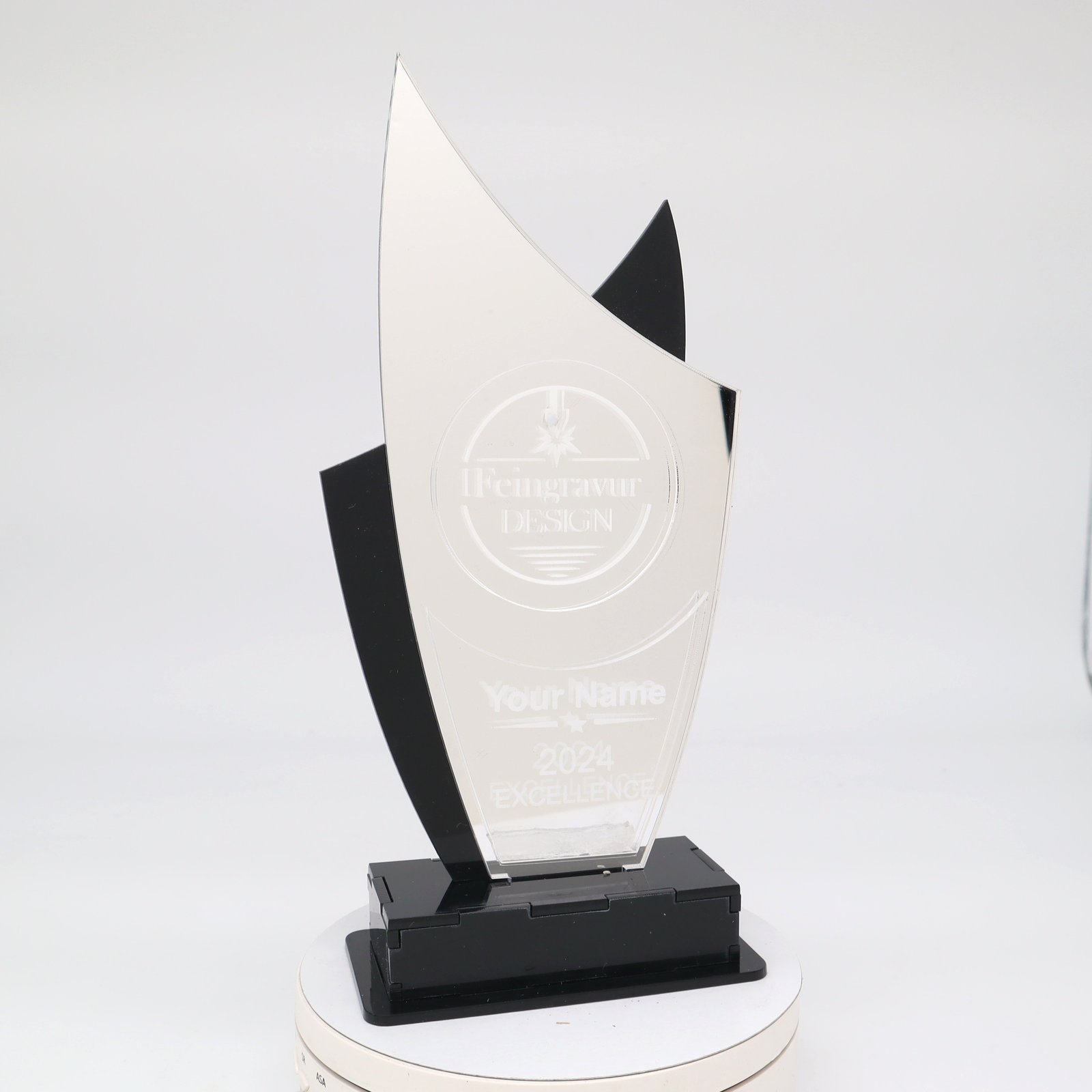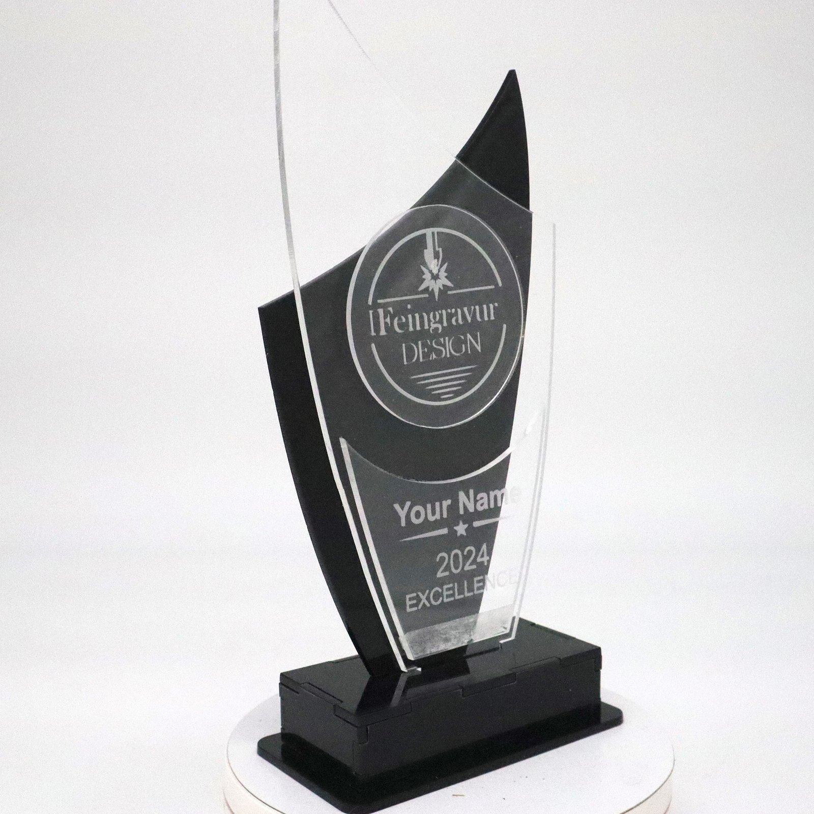 Eleganz in Harmonie – Die Trophäe aus der Kombination aus farbigen und klarem Acryl und persönlicher Gravur in Spiegel Acryl.