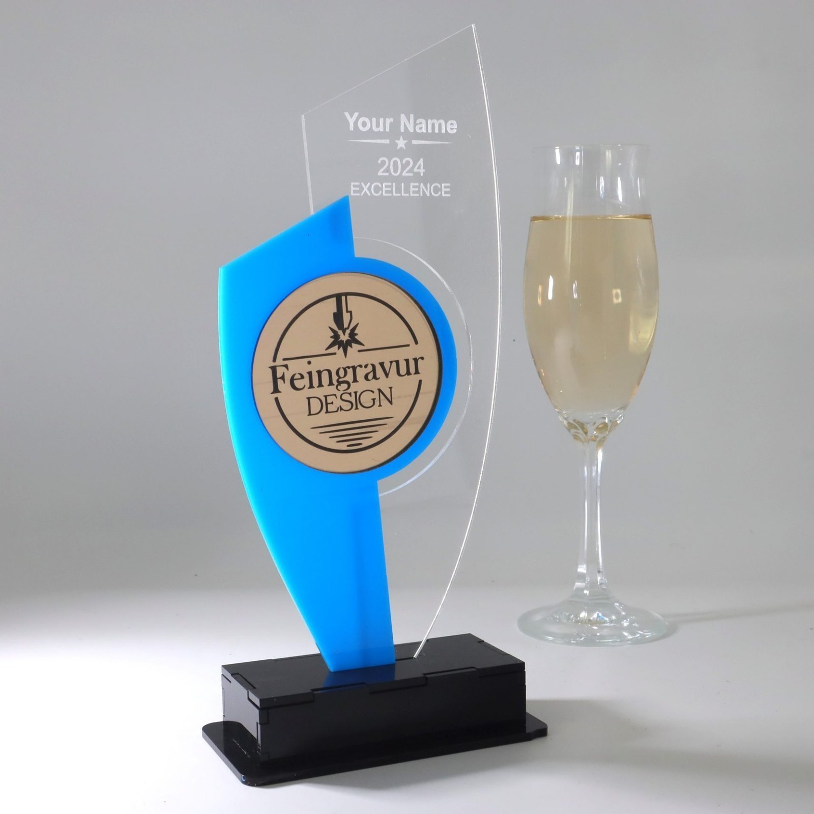 Eleganz in Harmonie – Die Trophäe aus der Kombination aus farbigen und klarem Acryl und persönlicher Gravur in Spiegel Acryl.