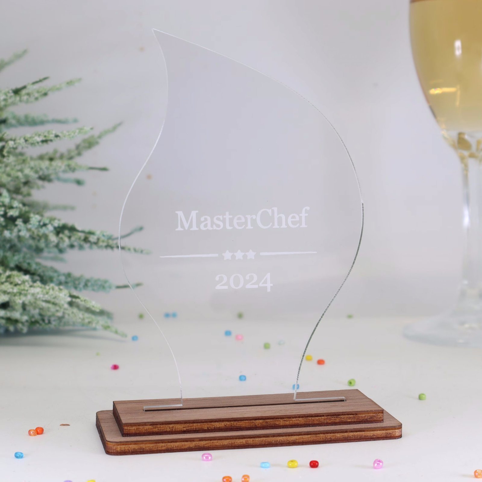 Eleganz in Harmonie – Die Trophäe aus edlem Nussbaum mit Acryl und persönlicher Gravur.