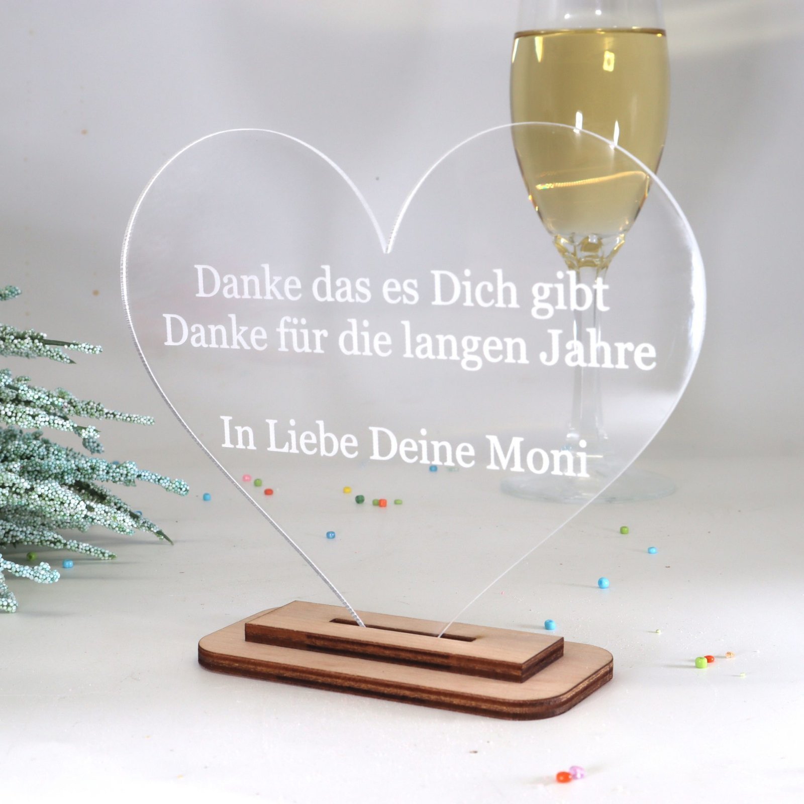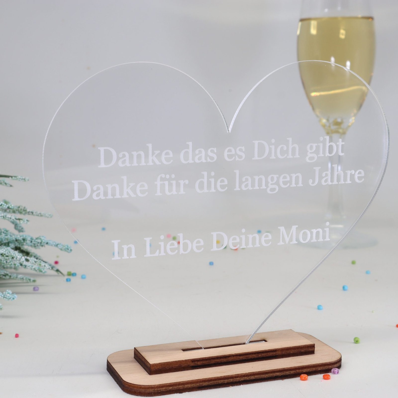 Unser exquisites personalisiertes Herz aus durchsichtigen Acryl mit einem Holzständer aus feinstem Ahorn ist eine einzigartige und liebevolle Geschenkidee für verschiedene Anlässe und ein kleiner Liebesbeweis.