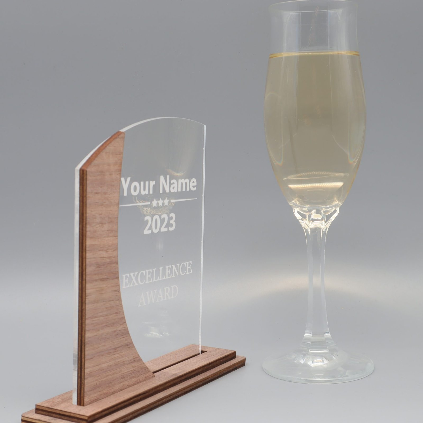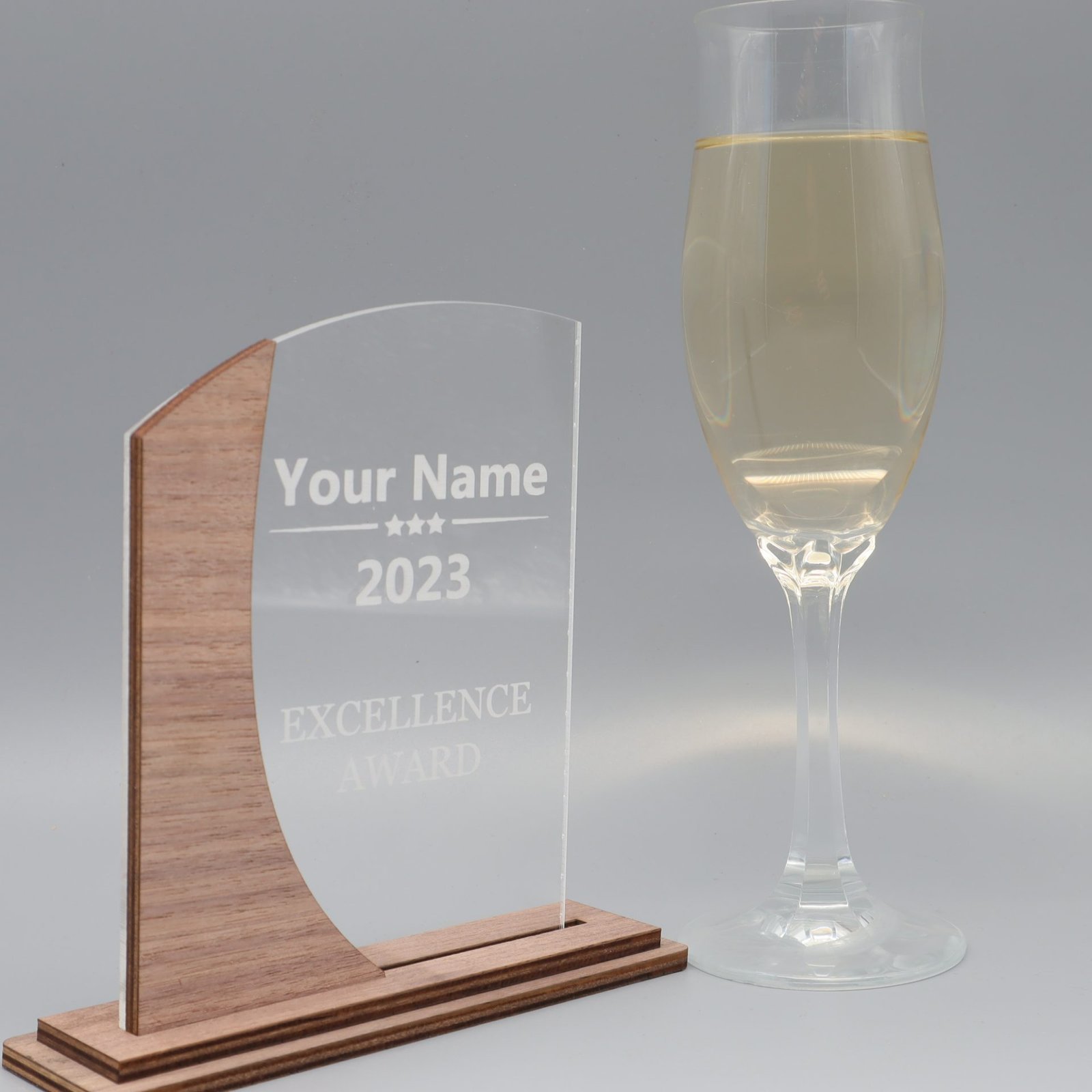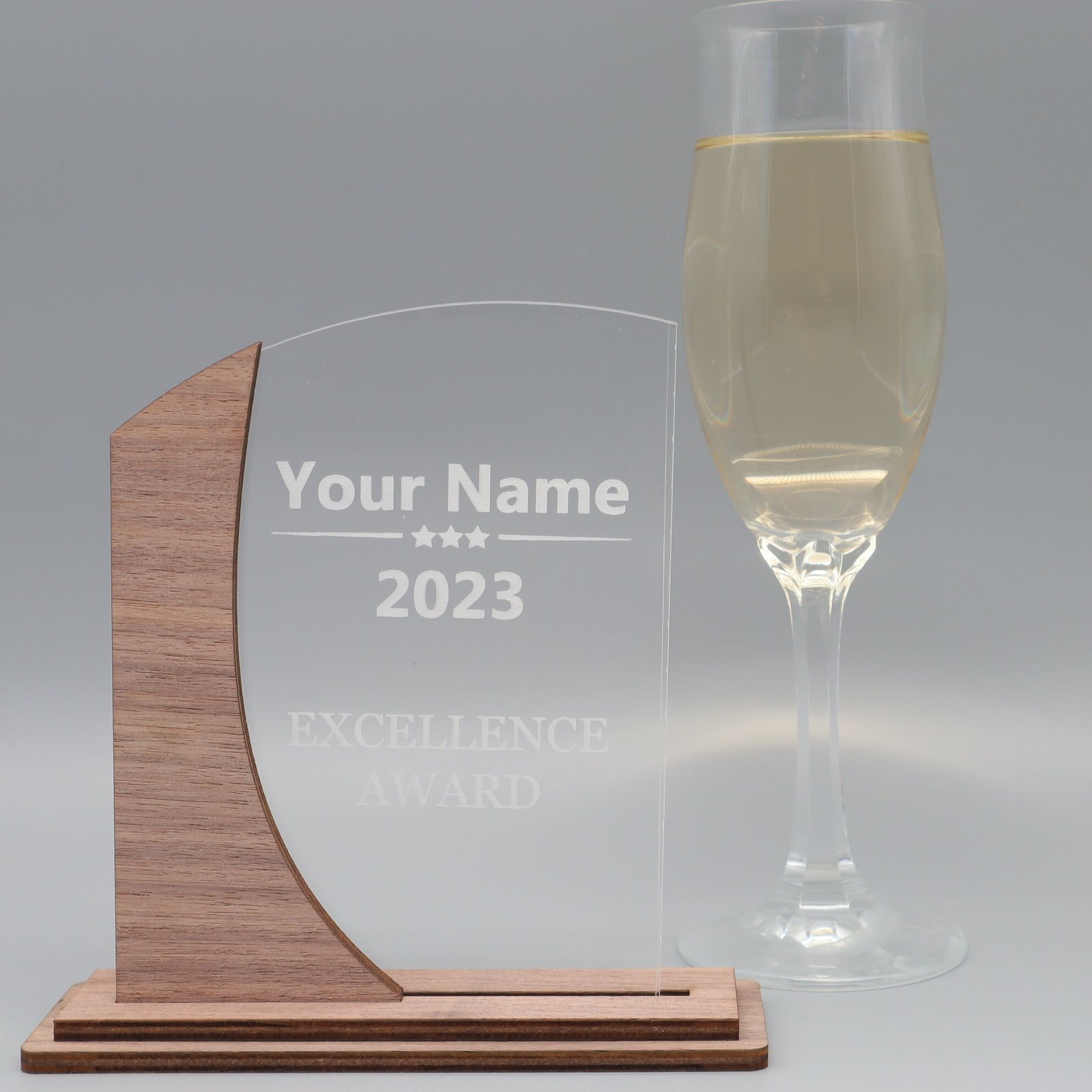 Eleganz in Harmonie – Die Trophäe aus edlem Nussbaum mit Acryl und persönlicher Gravur.