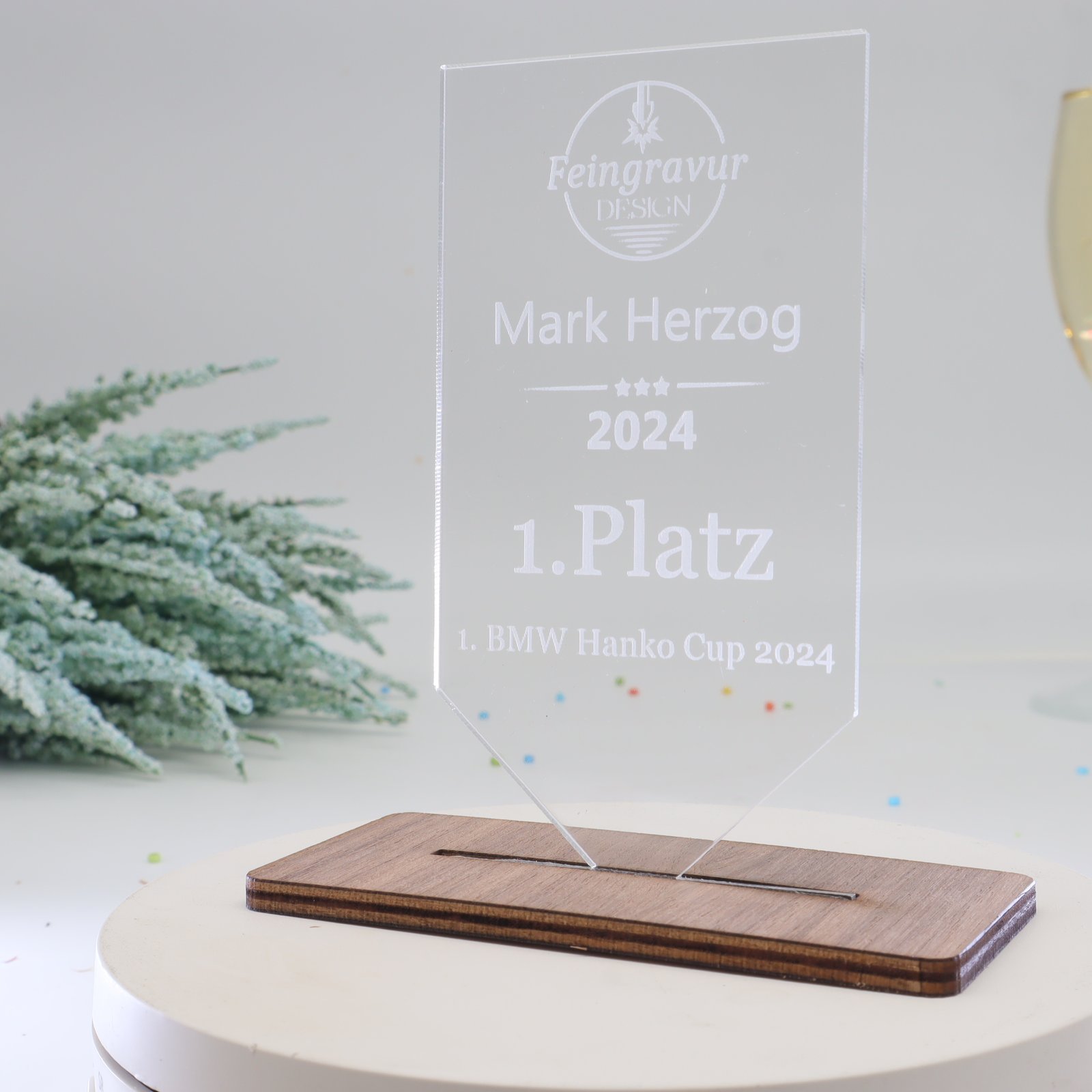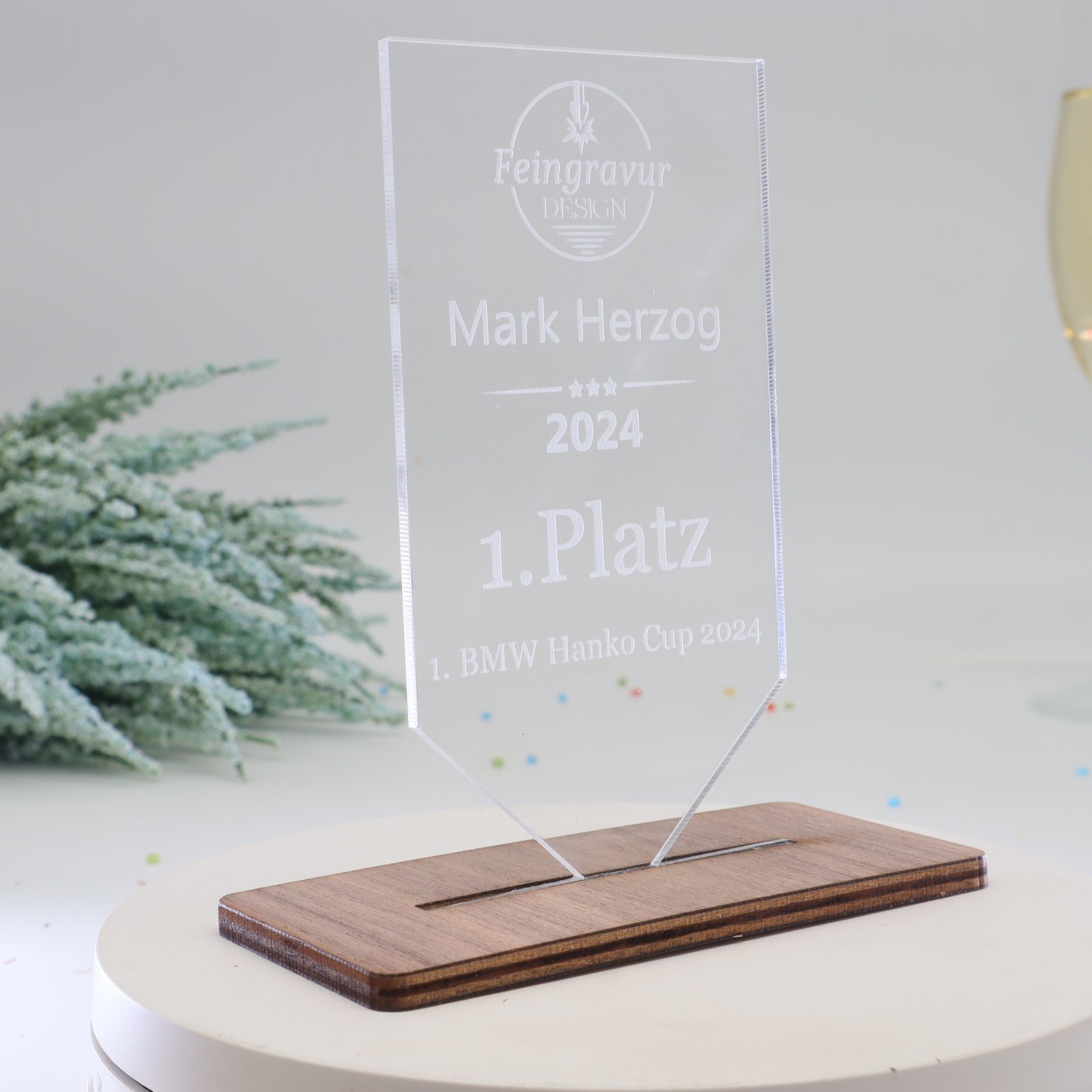Eleganz in Harmonie – Die Trophäe aus edlem Nussbaum mit Acryl und persönlicher Gravur.