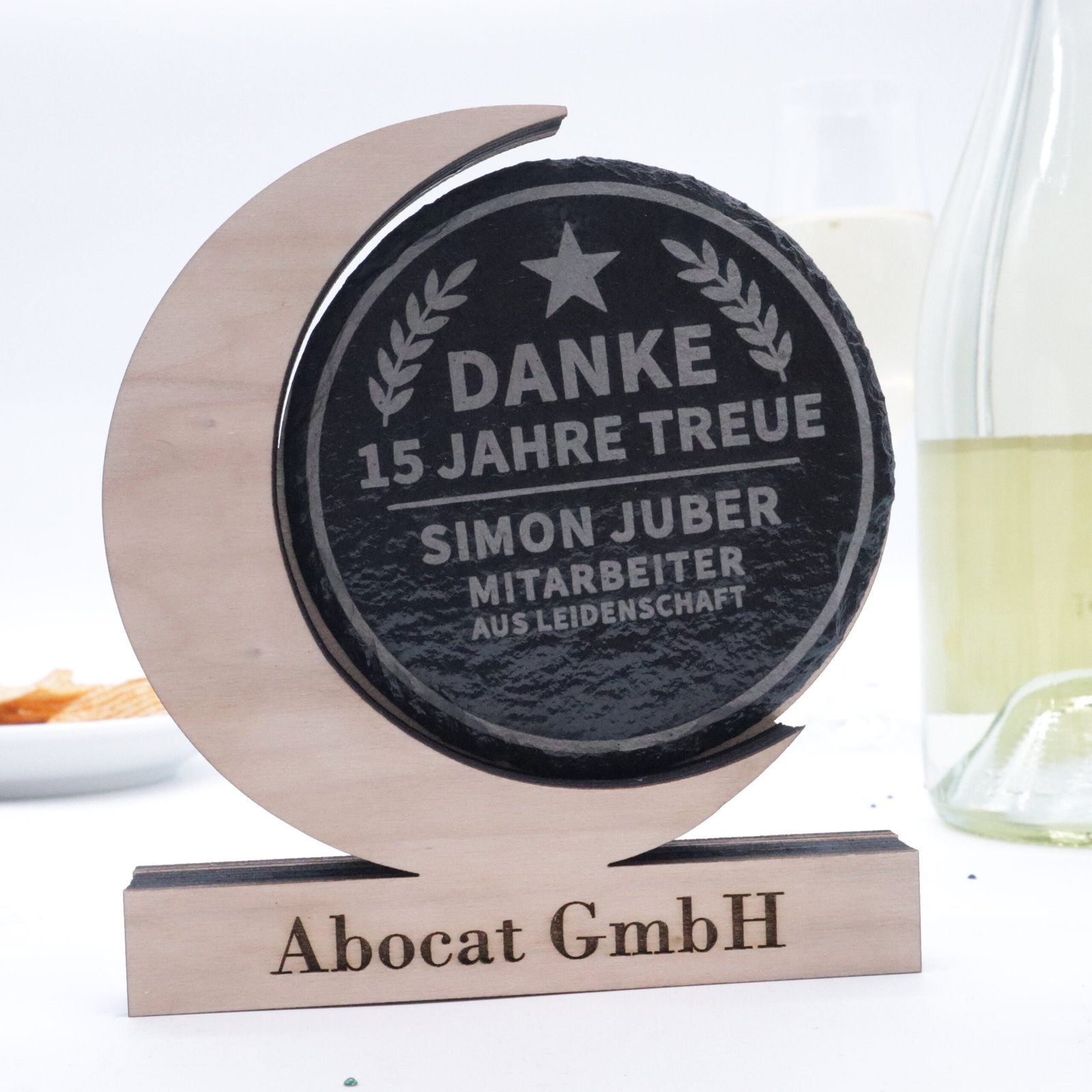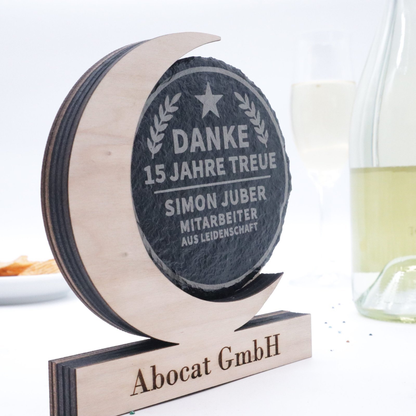 Diese edle Trophäe aus hochwertigem Sperrholz mit gravierbarer Schiefertafel ist das perfekte Geschenk für besondere Anlässe, Ehrungen oder als stilvolle Auszeichnung.