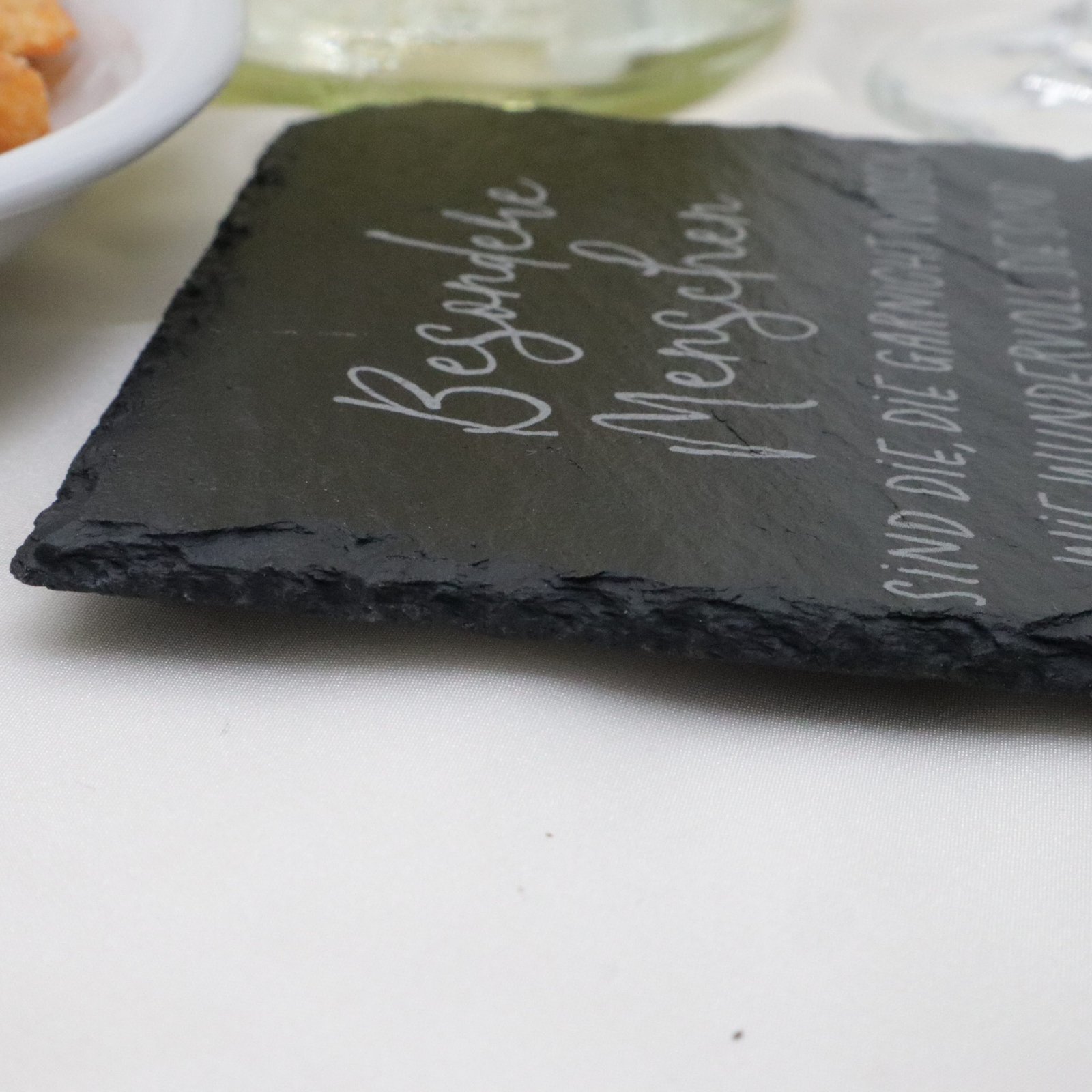 Setzen Sie ein Zeichen der Wertschätzung mit unseren hochwertigen Schieferuntersetzern, graviert mit der herzlichen Botschaft: „Besondere Menschen …“
