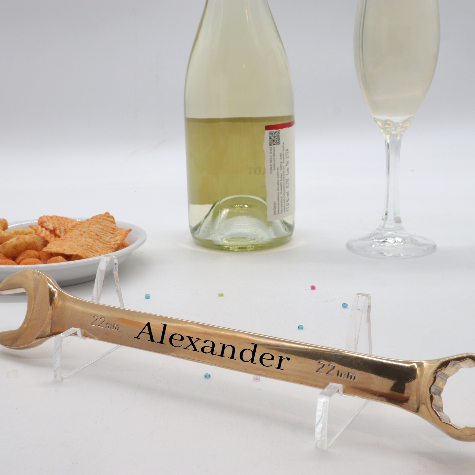Verleihen Sie Ihrem Geschenk eine persönliche Note mit einer hochpräzisen Lasergravur! Jeder unserer 24-Karat-vergoldeten Ring- und Gabelschlüssel kann mit einem individuellen Namen, einer Widmung oder einem besonderen Symbol veredelt werden.