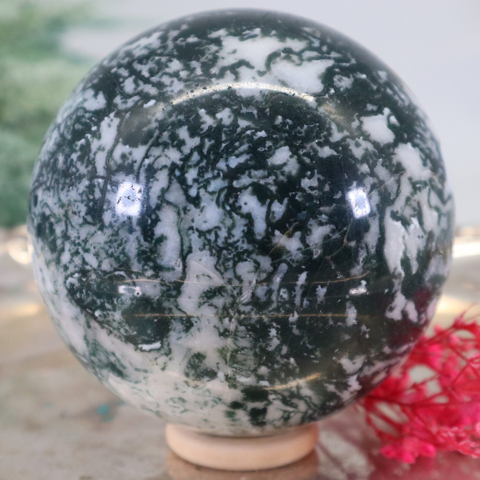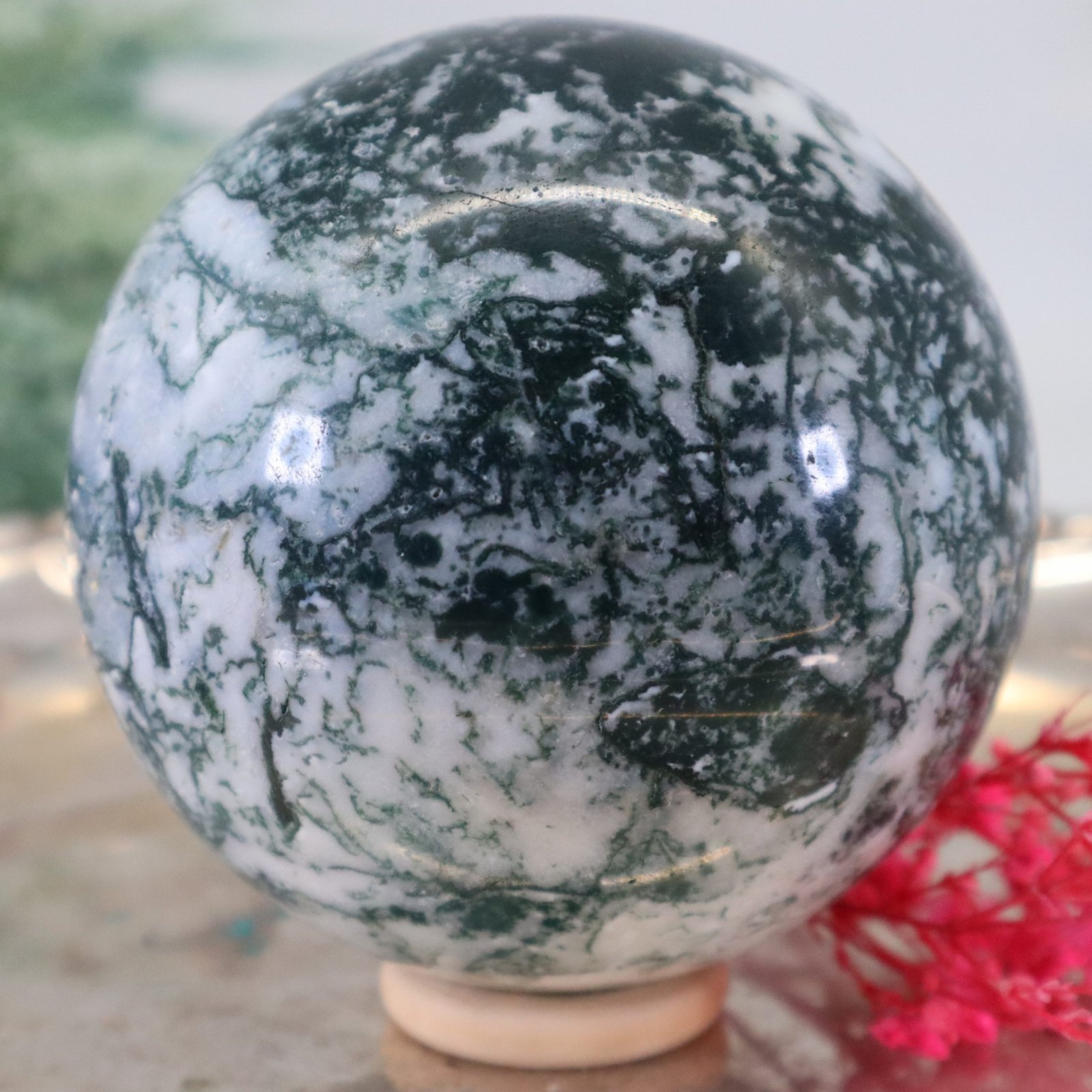 - Größe: Mit einem Durchmesser von 79 mm ist deine Moosachatkugel ziemlich groß und schwer, was sie zu einem auffälligen Dekorationsobjekt macht.