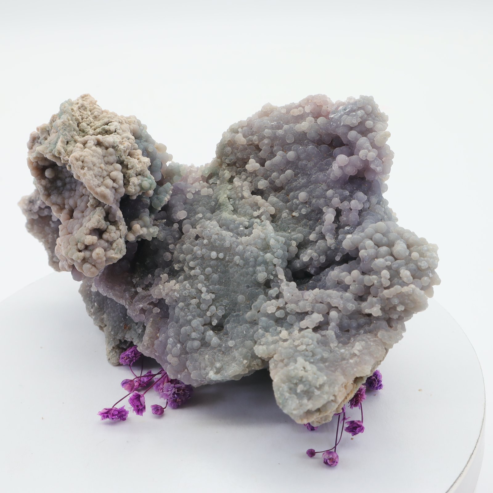 Traubenachat ist der Name für den botryoiden Purple Chalcedon, der kürzlich in Indonesien entdeckt wurde. Botryoide bedeutet, dass sich runde Kristalle auf natürliche Weise zusammen gebildet haben. Bisher wurde nur eine Fundstelle gefunden, was diesen Stein zu einem äußerst seltenen und wertvollen Stein macht. Die Farben reichen von dunklem Lila bis zu einem hellen Flieder oder Lavendel.