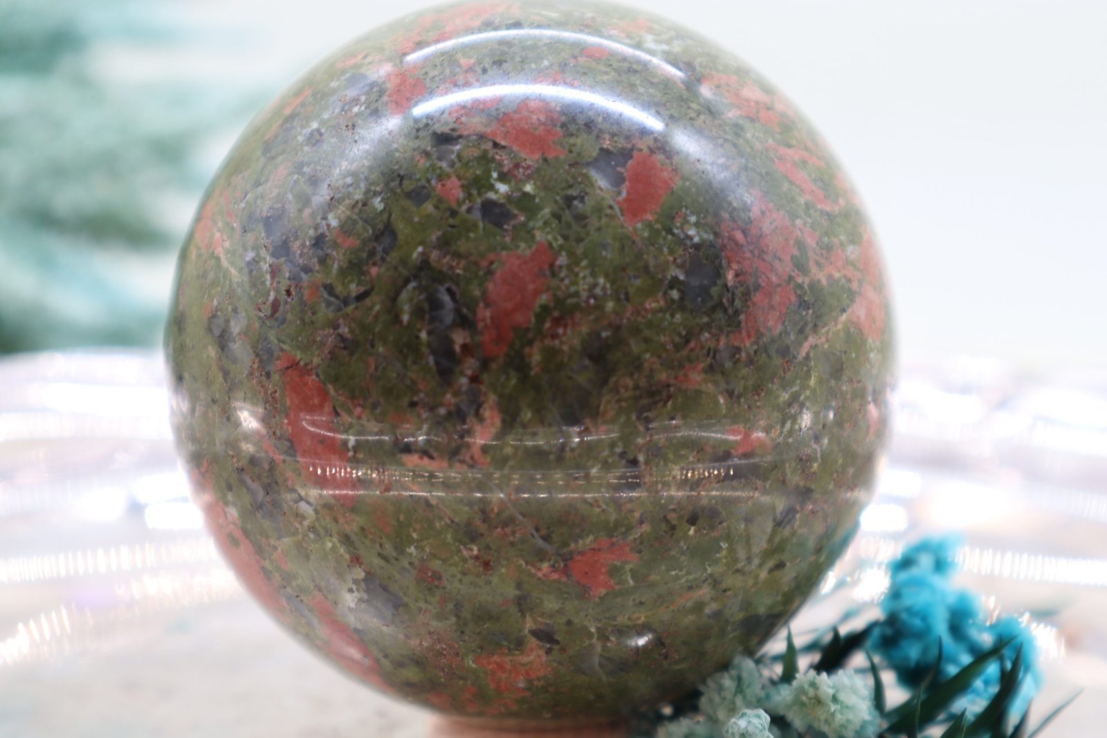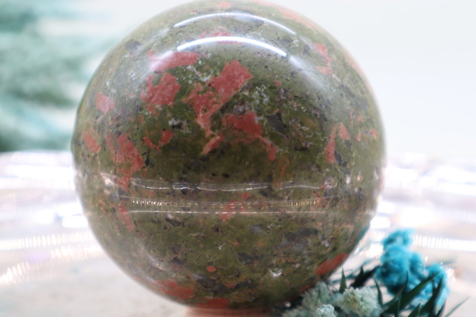 - Das Muster einer Unakit-Kugel ist unregelmäßig und einzigartig, da es von der natürlichen Zusammensetzung des Steins abhängt. Die grünen und rosa Flecken und Adern verlaufen zufällig über die Oberfläche, was jeder Kugel ein individuelles Aussehen verleiht.
