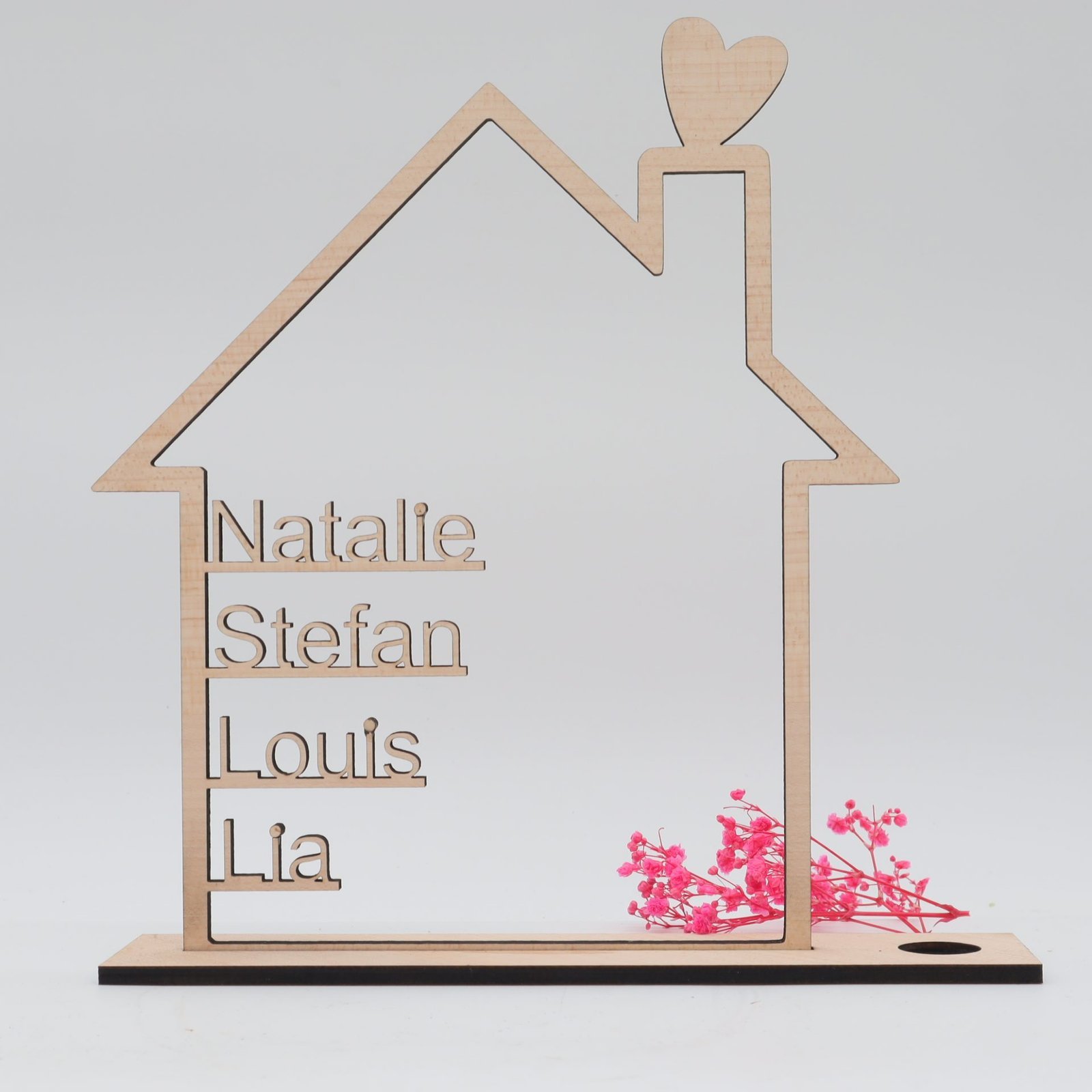 Motiv Holzhaus mit personalisierten Namen aus 5 mm Ahornsperrholz, präzise geschnitten