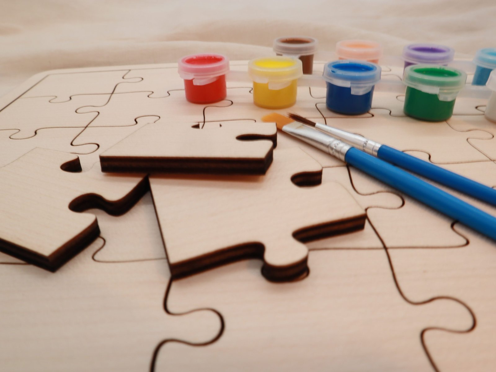Holzpuzzle, unbehandeltes blanko Puzzle zum selbst bemalen, rohe Puzzle Teile, mit Farben und Pinsel, 42 Teile ab 3+ Plus