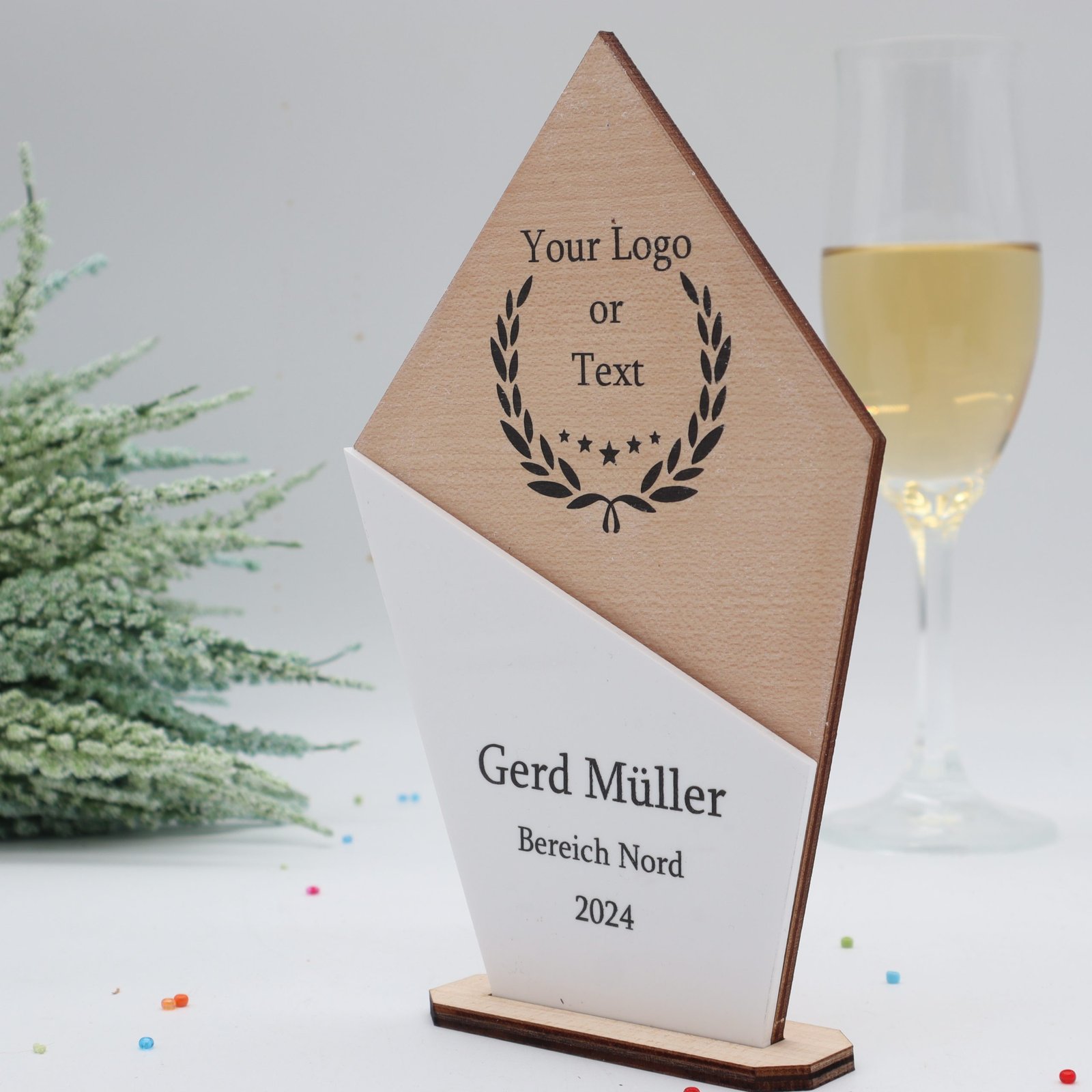 Moderne edle Sport Trophäe, eigener Text Logo, Nussbaum und Acryl – Personalisierte Gravur – Pokal – Auszeichnung – Elegante Ehrungen