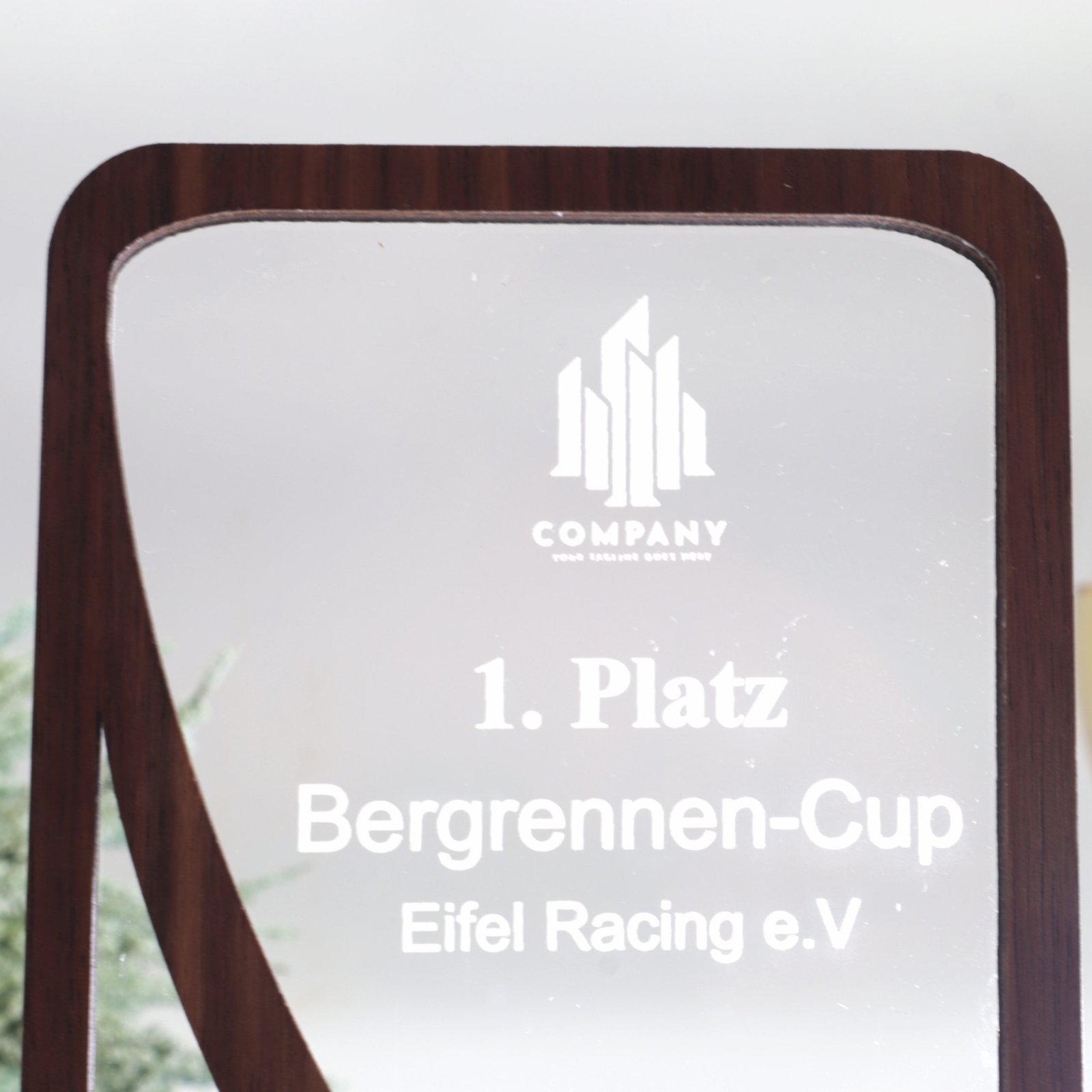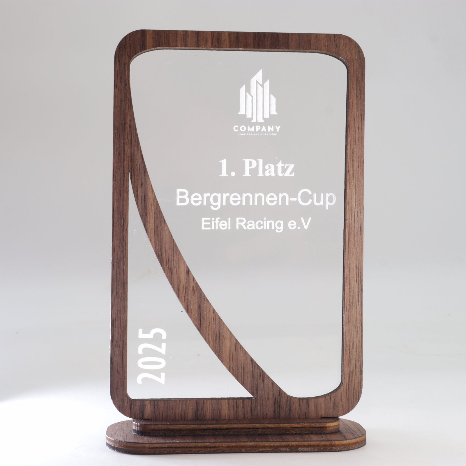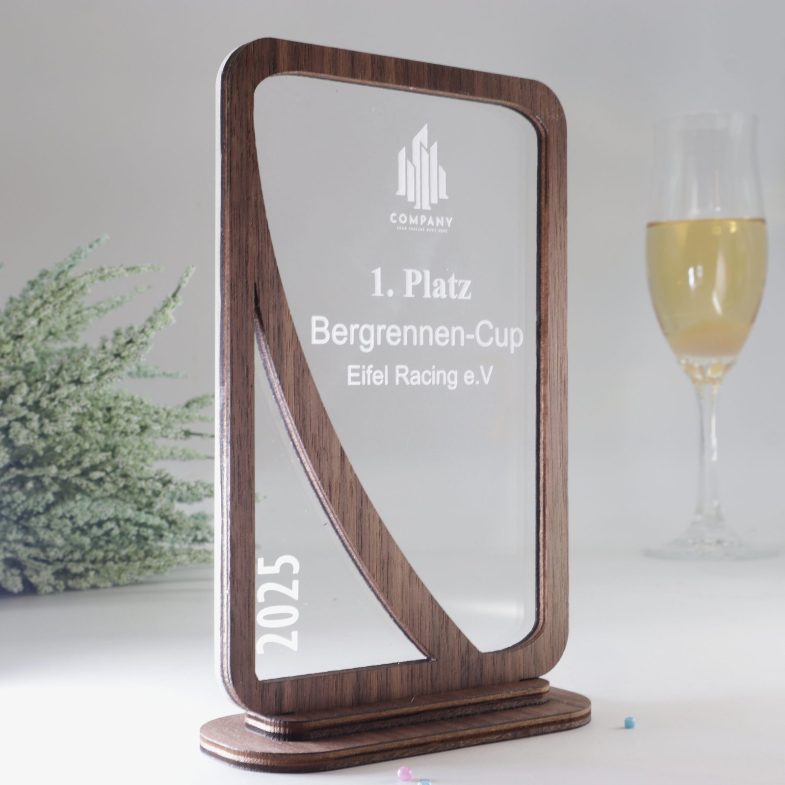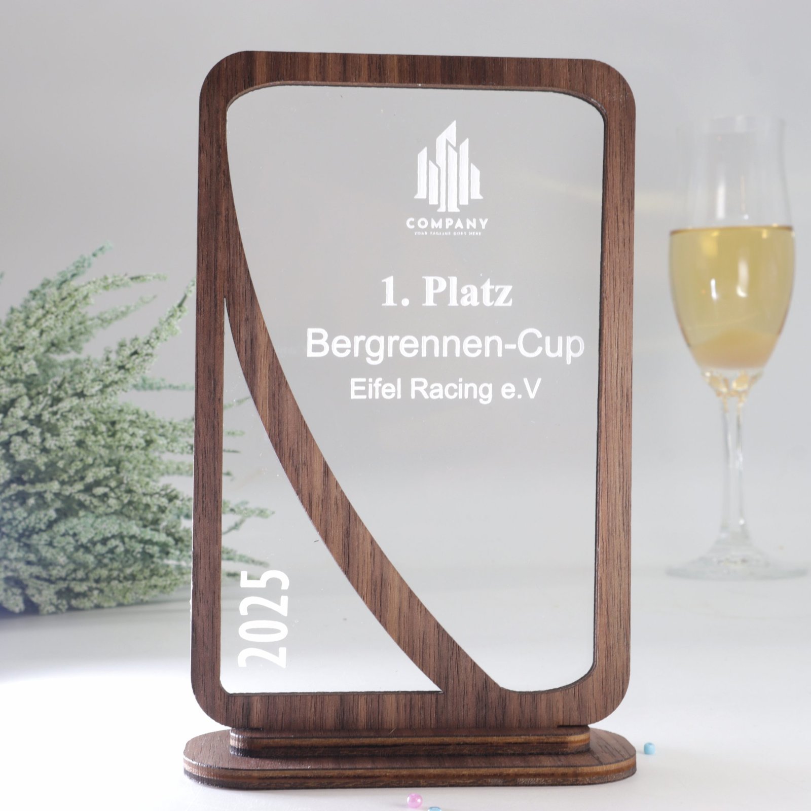 Personalisierter Pokal und Trophäe, Acryl Glas und Nussbaum Holz
