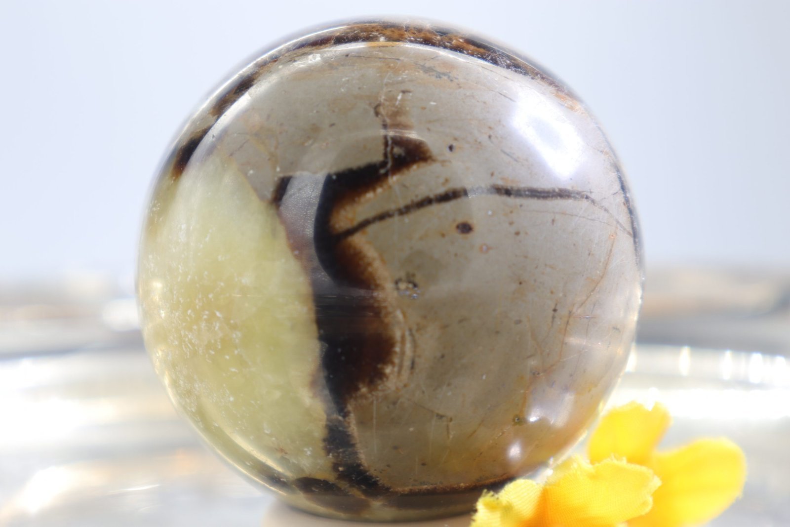 Der gelbe Kristall besitzt ein einzigartiges Muster, dass die Kugel an manchen stellen leicht Schimmern lässt.