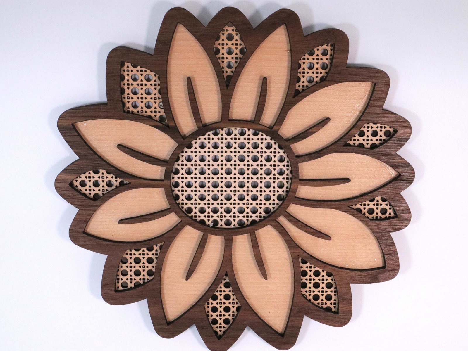 Schreibe die erste Rezension für „SONNENBLUME mit RATTAN Muster aus Nussbaum und Buche Sperrholz“