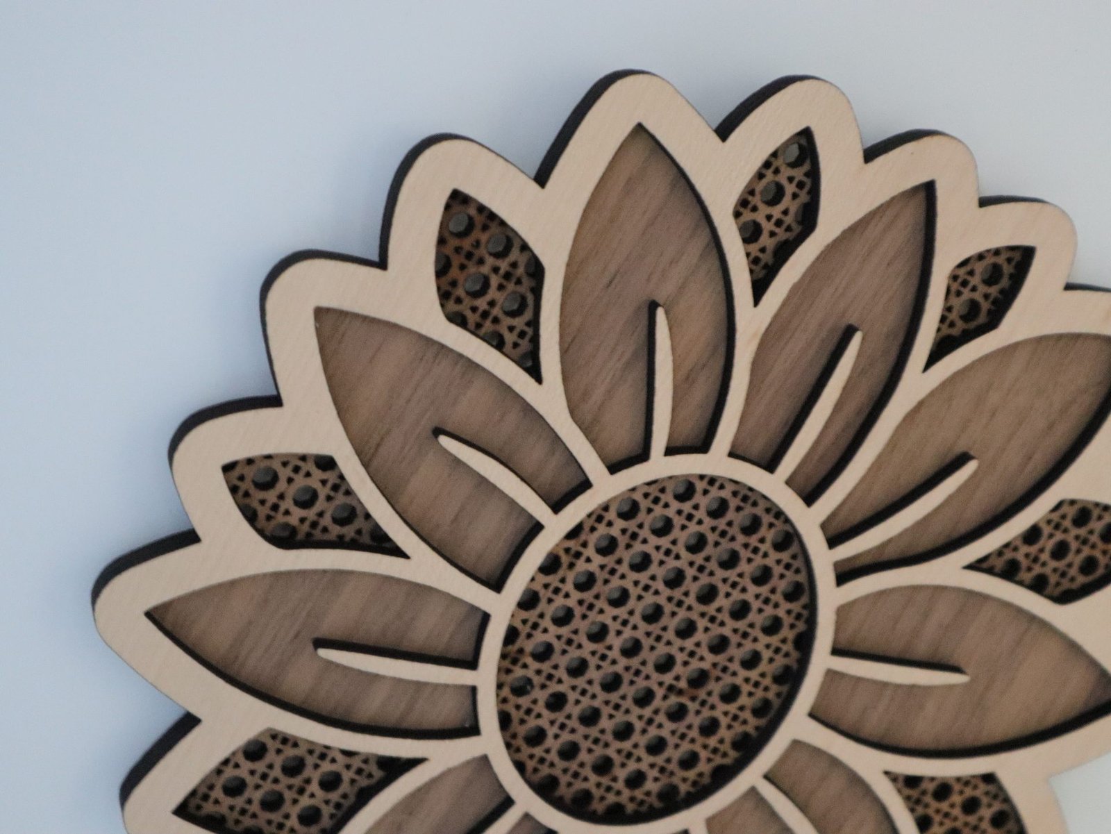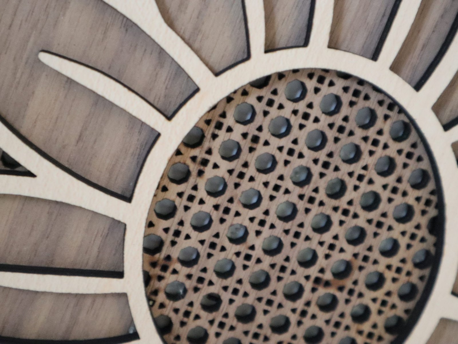 SONNENBLUME mit RATTAN Muster aus Nussbaum und Buche Sperrholz