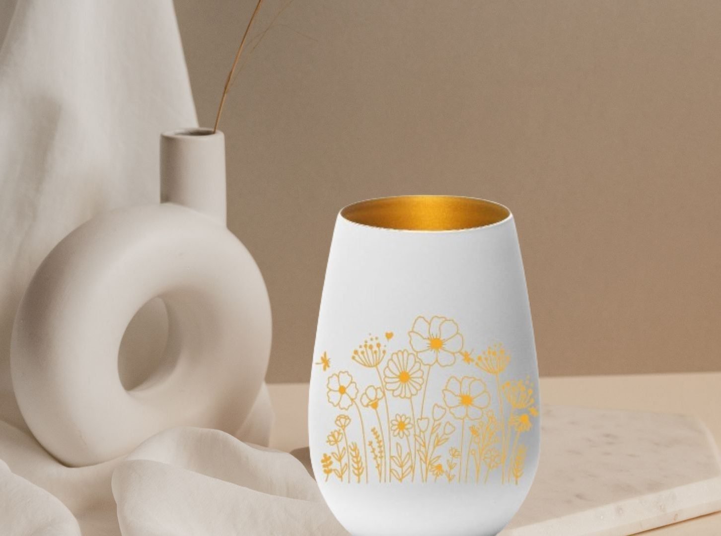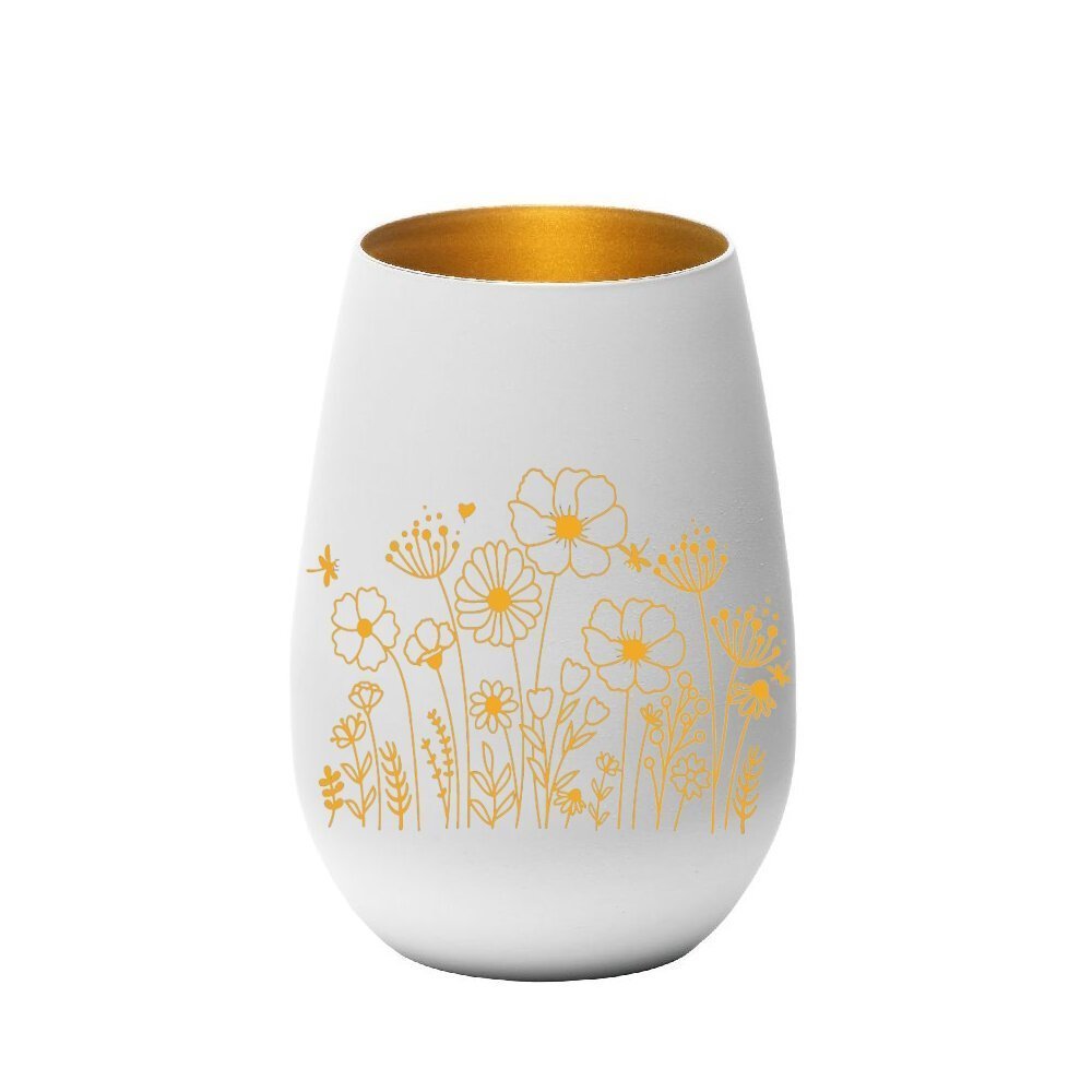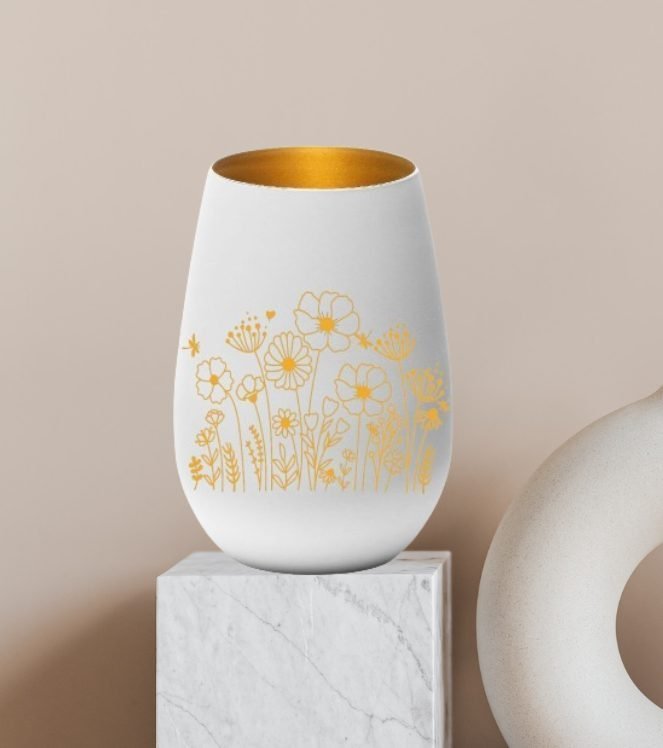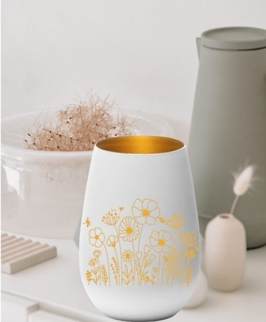 Aus hochwertigem weißem Glas und goldenem Innern mit Wildblumen graviert. Das Blumen Motiv leuchtet sanft und beruhigend wenn ein Teelicht darin leuchtet.